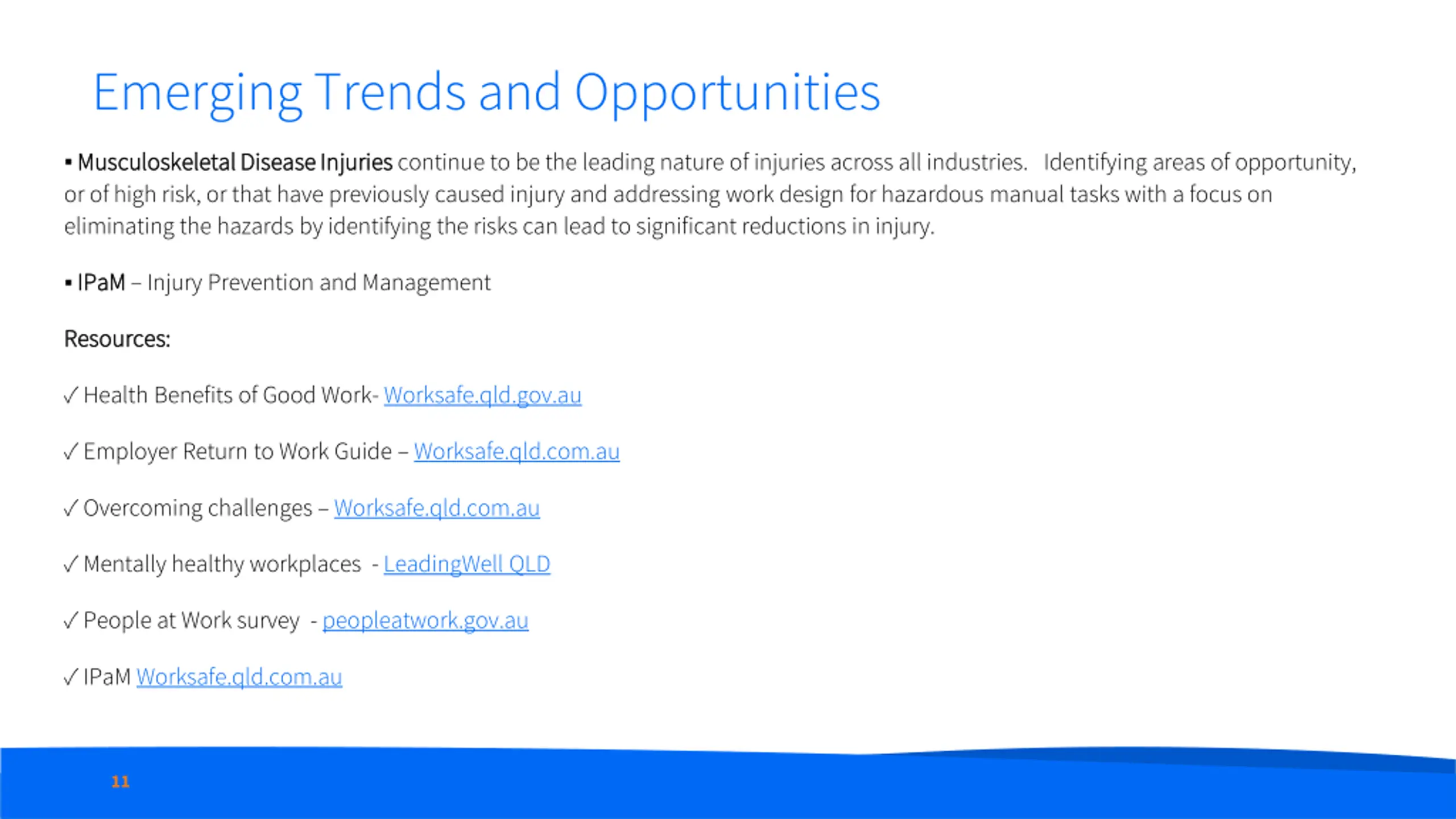 Emerging Trends and Opportunities Musculoskeletal Disease Injuries Musculoskeletal Disease Injuries continue to be the leading nature of injuries across all industries. Identifying areas of opportunity, or of high risk, or that have previously caused injury and addressing work design for hazardous manual tasks with a focus on eliminating the hazards by identifying the risks can lead to significant reductions in injury. IPaM IPaM Injury Prevention and Management Resources: Resources: Health Benefits of Good Work- Worksafe.qld.gov.au Employer Return to Work Guide Worksafe.qld.com.au Overcoming challenges Worksafe.qld.com.au Mentally healthy workplaces - LeadingWell QLD People at Work survey - peopleatwork.gov.au IPaM Worksafe.qld.com.au 11