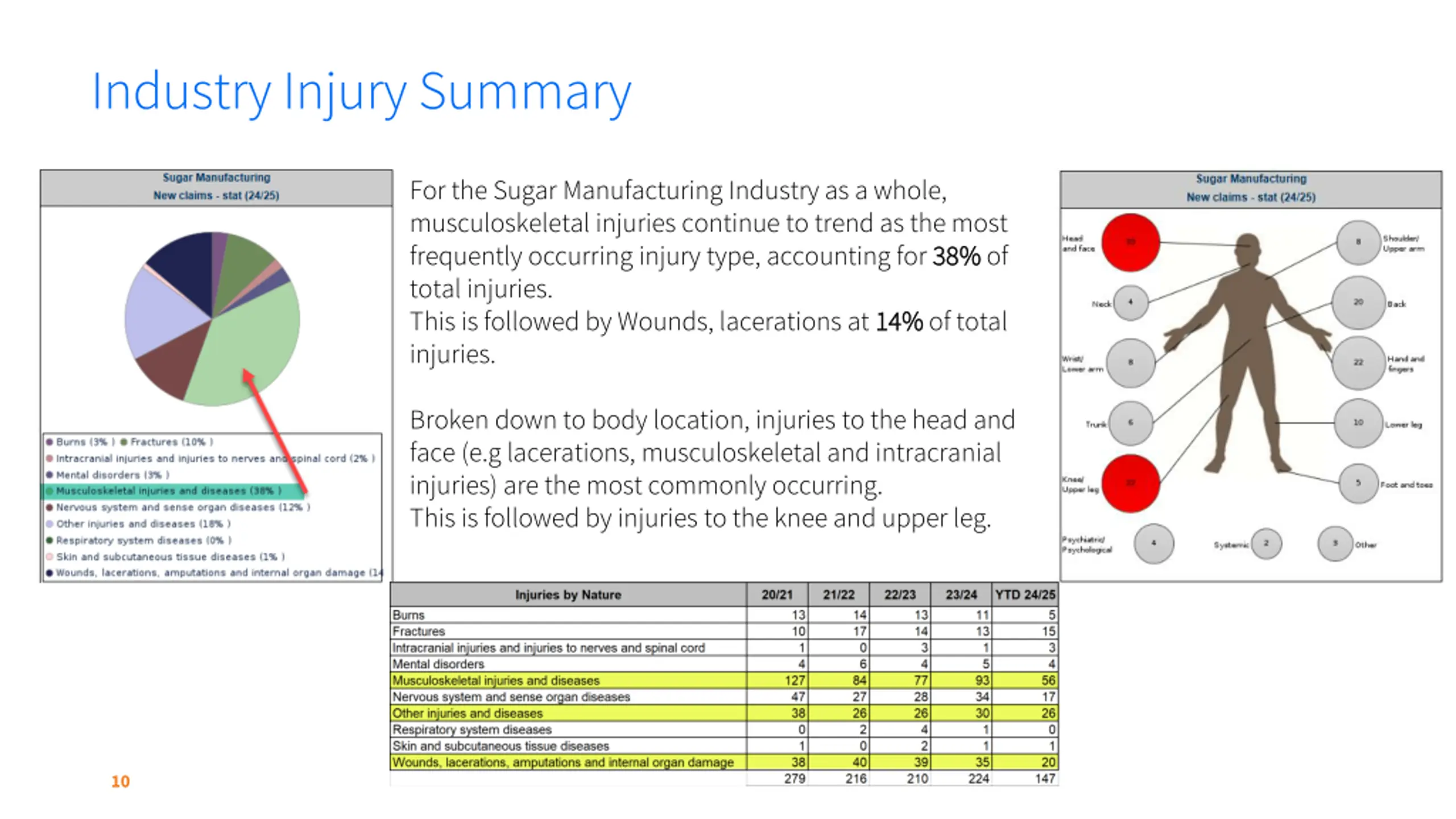 Industry Injury Summary For the Sugar Manufacturing Industry as a whole, musculoskeletal injuries continue to trend as the most frequently occurring injury type, accounting for 38% total injuries. This is followed by Wounds, lacerations at 14% injuries. 38% of 14% of total Broken down to body location, injuries to the head and face (e.g lacerations, musculoskeletal and intracranial injuries) are the most commonly occurring. This is followed by injuries to the knee and upper leg. 10