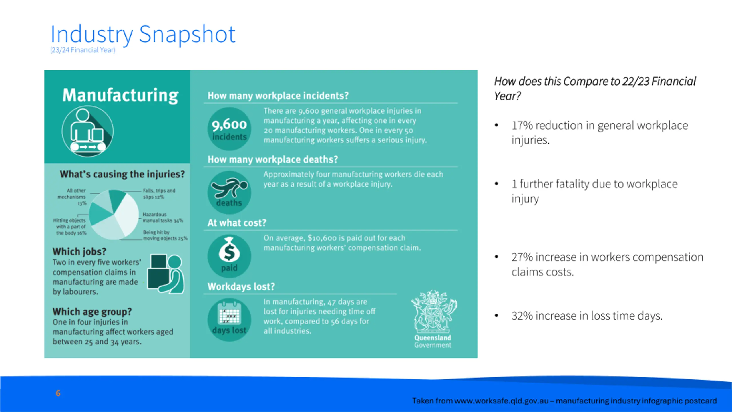 Industry Snapshot (23/24 Financial Year) How does this Compare to 22/23 Financial How does this Compare to 22/23 Financial Year? Year? 17% reduction in general workplace injuries. 1 further fatality due to workplace injury 27% increase in workers compensation claims costs. 32% increase in loss time days. 6 Taken from www.worksafe.qld.gov.au manufacturing industry infographic postcard