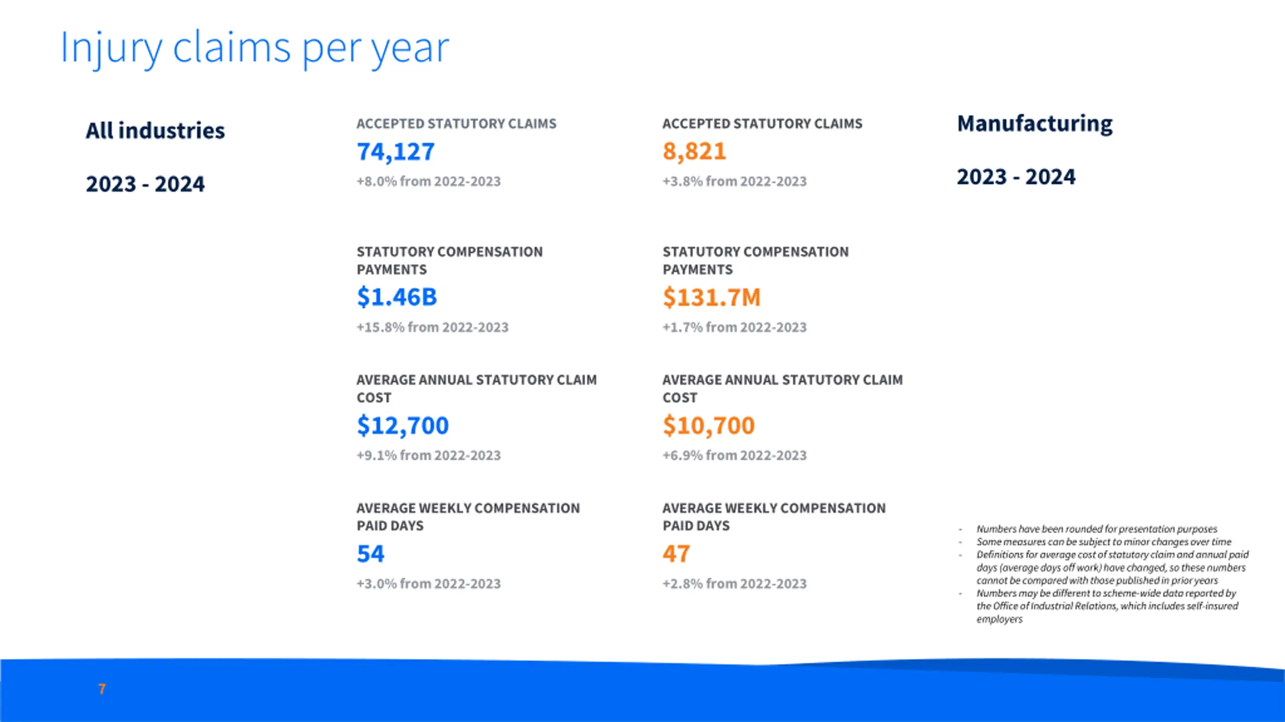 Injury claims per year Manufacturing ACCEPTED STATUTORY CLAIMS 74,127 +8.0% from 2022-2023 ACCEPTED STATUTORY CLAIMS 8,821 +3.8% from 2022-2023 All industries 2023 - 2024 2023 - 2024 STATUTORY COMPENSATION PAYMENTS $1.46B +15.8% from 2022-2023 STATUTORY COMPENSATION PAYMENTS $131.7M +1.7% from 2022-2023 AVERAGE ANNUAL STATUTORY CLAIM COST $12,700 +9.1% from 2022-2023 AVERAGE ANNUAL STATUTORY CLAIM COST $10,700 +6.9% from 2022-2023 AVERAGE WEEKLY COMPENSATION PAID DAYS 54 +3.0% from 2022-2023 AVERAGE WEEKLY COMPENSATION PAID DAYS 47 +2.8% from 2022-2023 - - - Numbers have been rounded for presentation purposes Some measures can be subject to minor changes over time Definitions for average cost of statutory claim and annual paid days (average days off work) have changed, so these numbers cannot be compared with those published in prior years Numbers may be different to scheme-wide data reported by the Office of Industrial Relations, which includes self-insured employers - 7