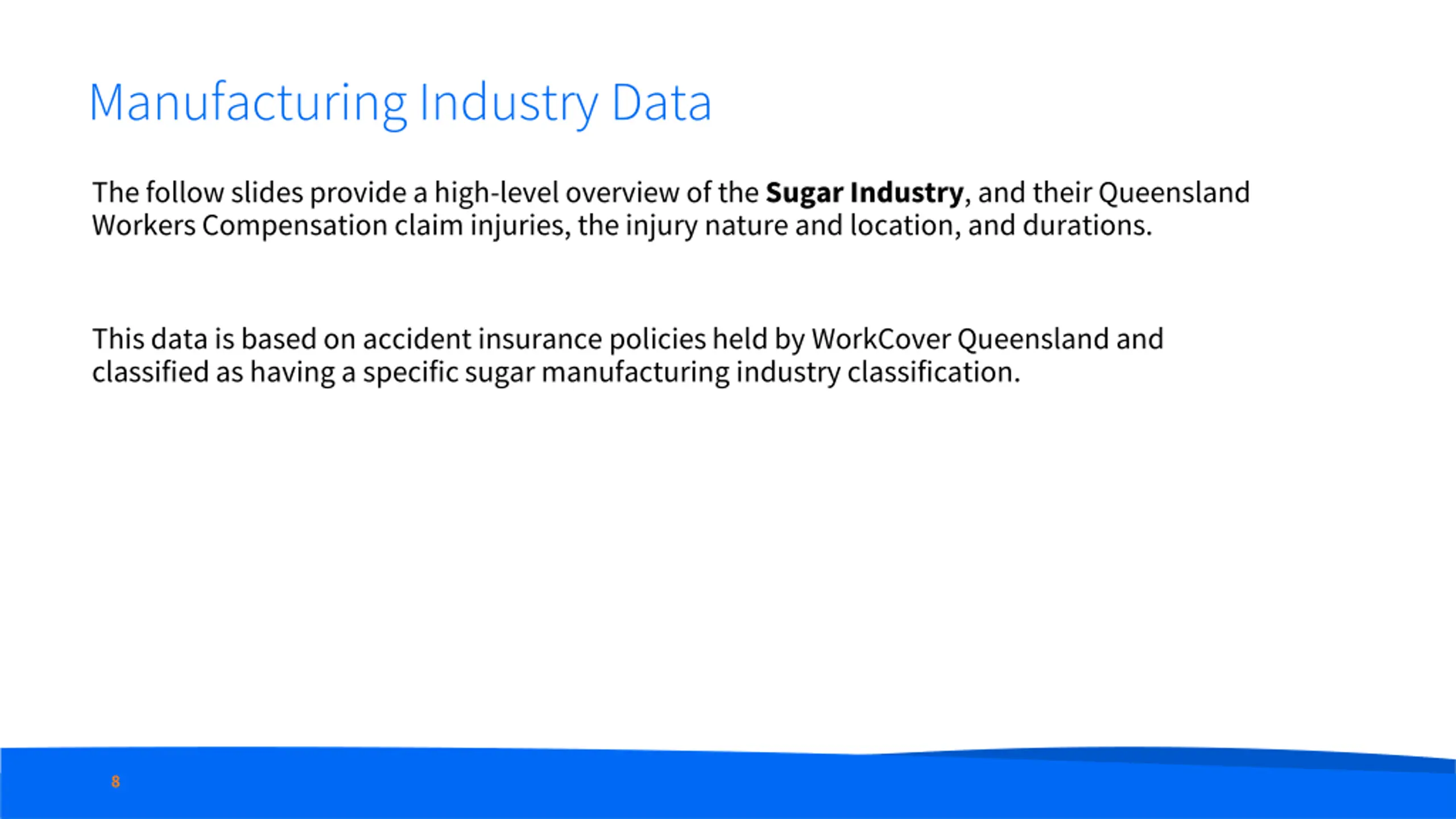 Manufacturing Industry Data The follow slides provide a high-level overview of the Sugar Industry, and their Queensland Workers Compensation claim injuries, the injury nature and location, and durations. This data is based on accident insurance policies held by WorkCover Queensland and classified as having a specific sugar manufacturing industry classification. 8