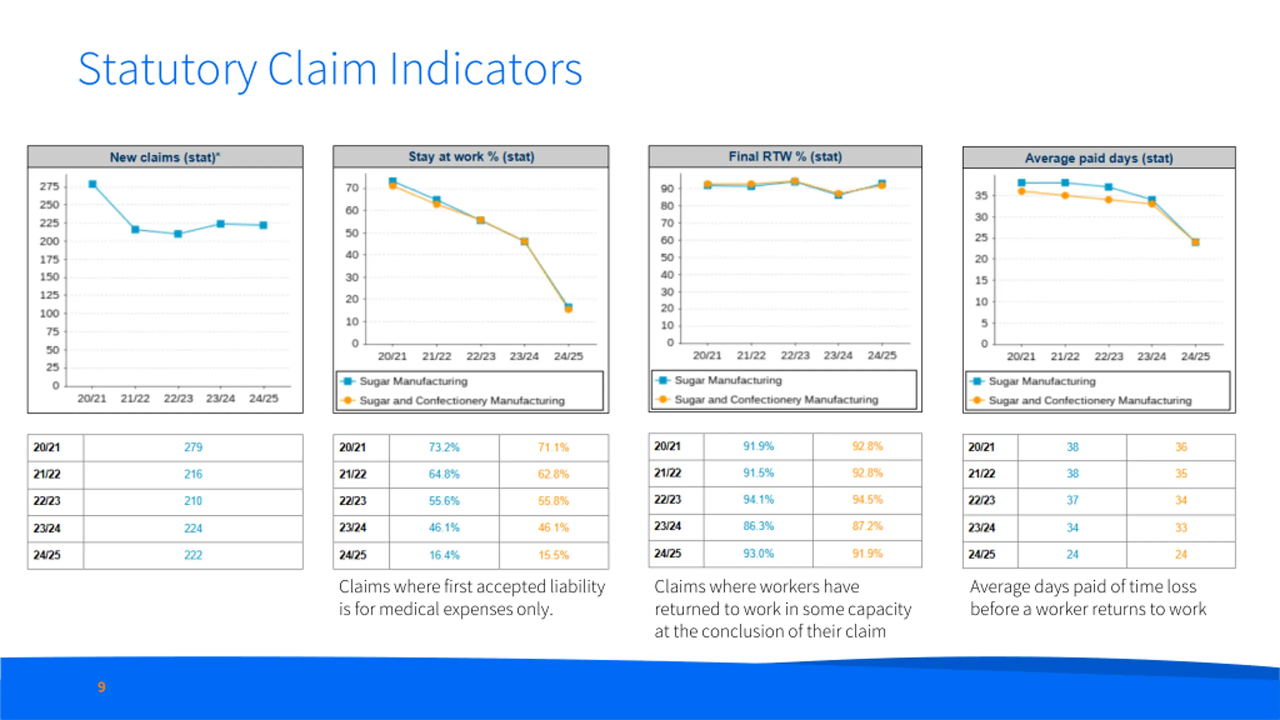 Statutory Claim Indicators Claims where first accepted liability is for medical expenses only. Claims where workers have returned to work in some capacity at the conclusion of their claim Average days paid of time loss before a worker returns to work 9