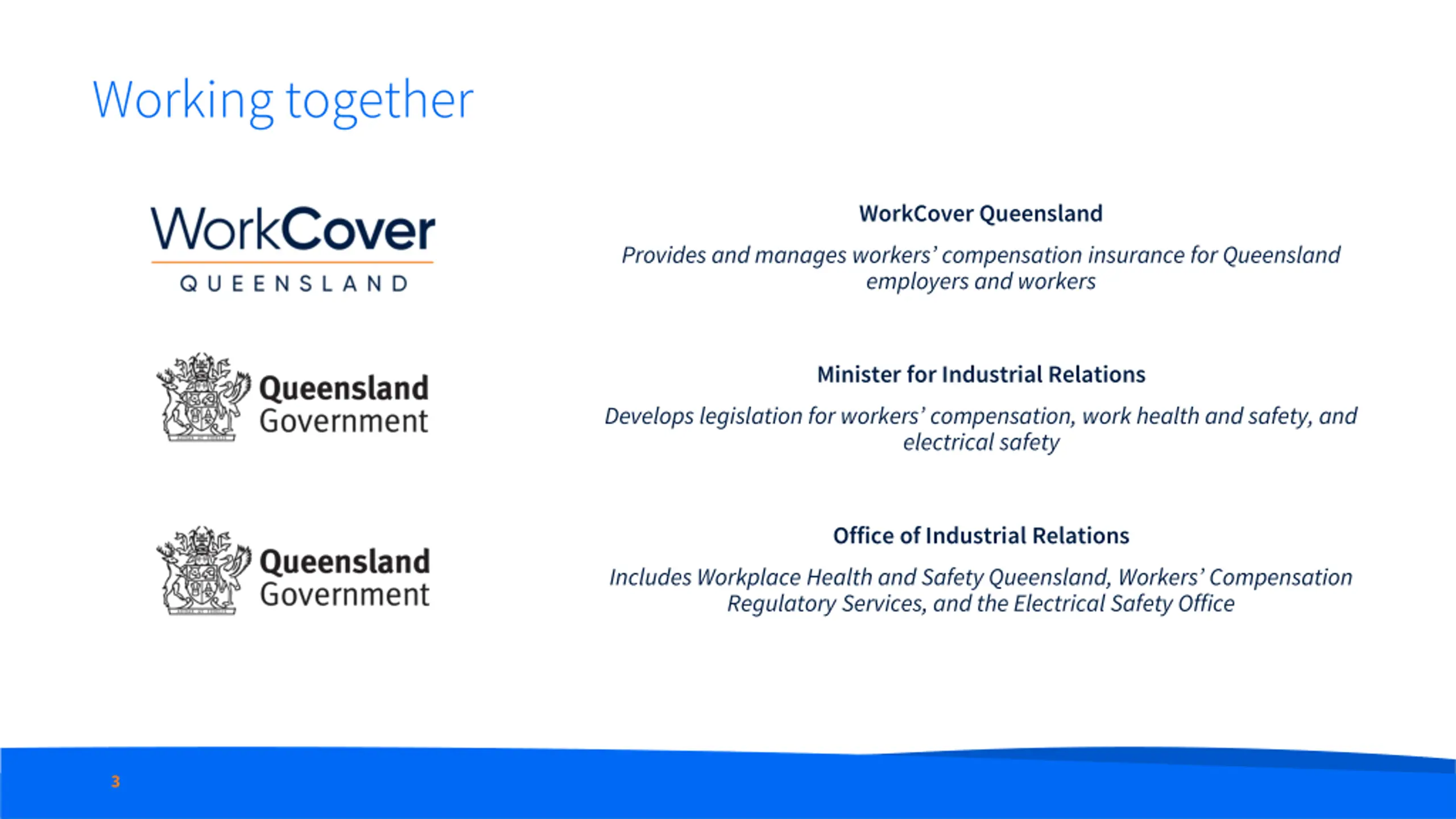 Working together WorkCover Queensland Provides and manages workers compensation insurance for Queensland employers and workers Minister for Industrial Relations Develops legislation for workers compensation, work health and safety, and electrical safety Office of Industrial Relations Includes Workplace Health and Safety Queensland, Workers Compensation Regulatory Services, and the Electrical Safety Office 3