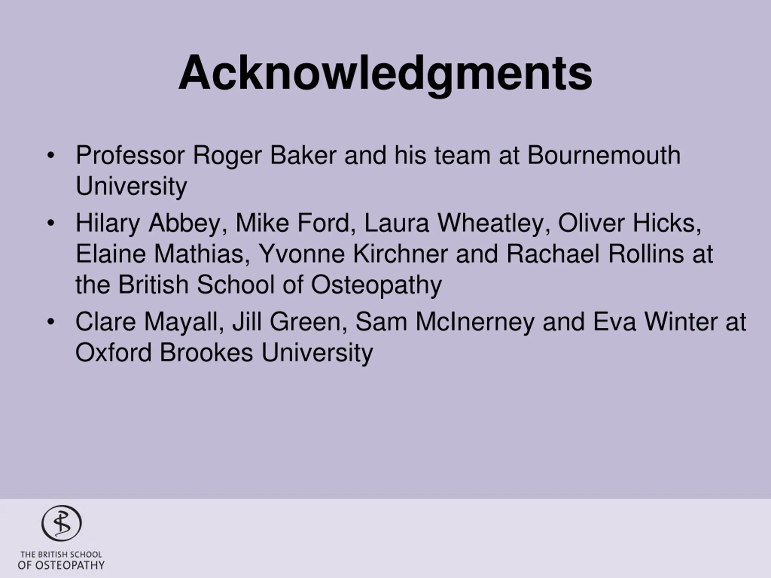 Acknowledgments Professor Roger Baker and his team at Bournemouth University Hilary Abbey, Mike Ford, Laura Wheatley, Oliver Hicks, Elaine Mathias, Yvonne Kirchner and Rachael Rollins at the British School of Osteopathy Clare Mayall, Jill Green, Sam McInerney and Eva Winter at Oxford Brookes University