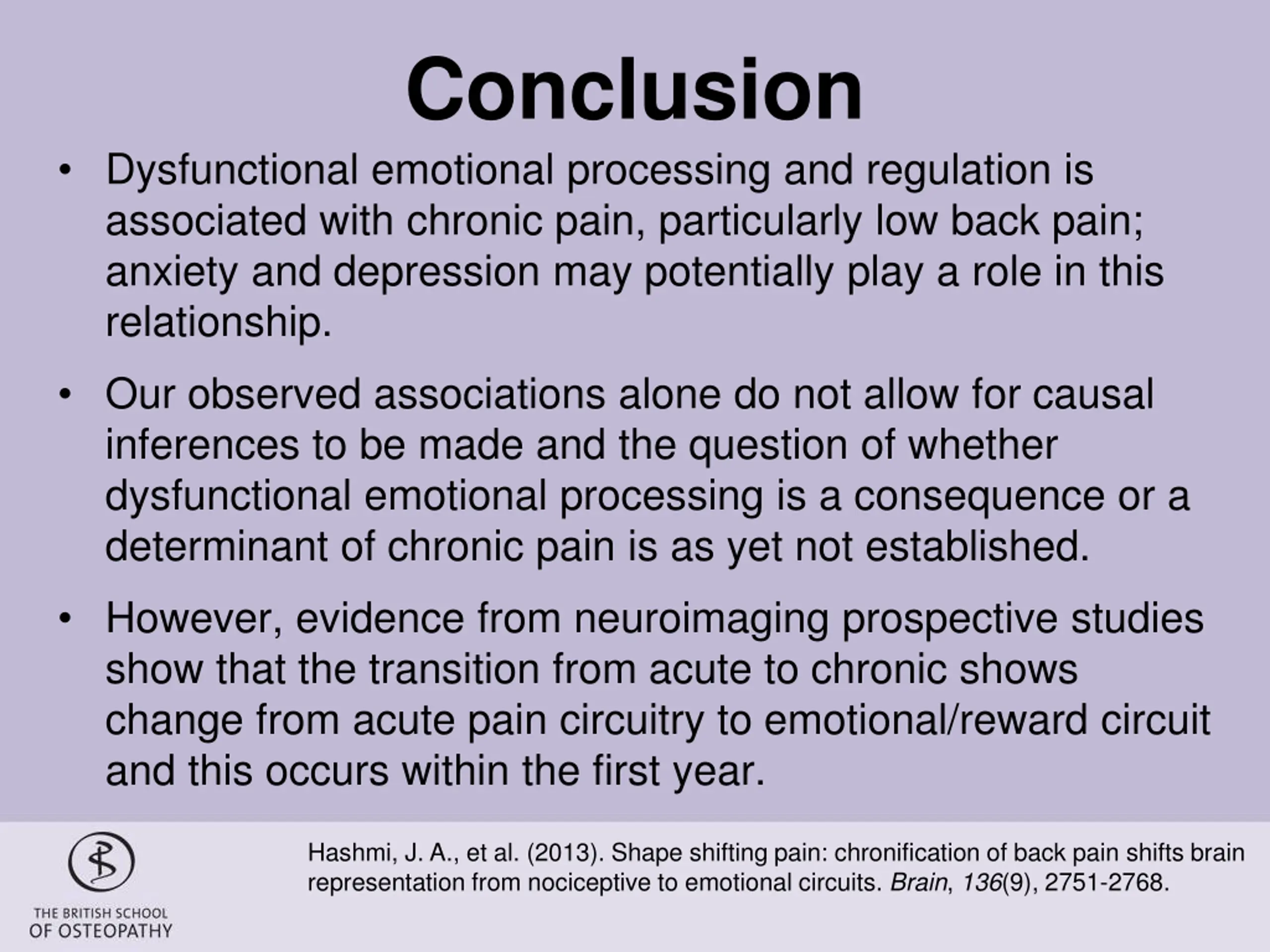 Conclusion Dysfunctional emotional processing and regulation is associated with chronic pain, particularly low back pain; anxiety and depression may potentially play a role in this relationship. Our observed associations alone do not allow for causal inferences to be made and the question of whether dysfunctional emotional processing is a consequence or a determinant of chronic pain is as yet not established. However, evidence from neuroimaging prospective studies show that the transition from acute to chronic shows change from acute pain circuitry to emotional/reward circuit and this occurs within the first year. Hashmi, J. A., et al. (2013). Shape shifting pain: chronification of back pain shifts brain representation from nociceptive to emotional circuits. Brain, 136(9), 2751-2768.