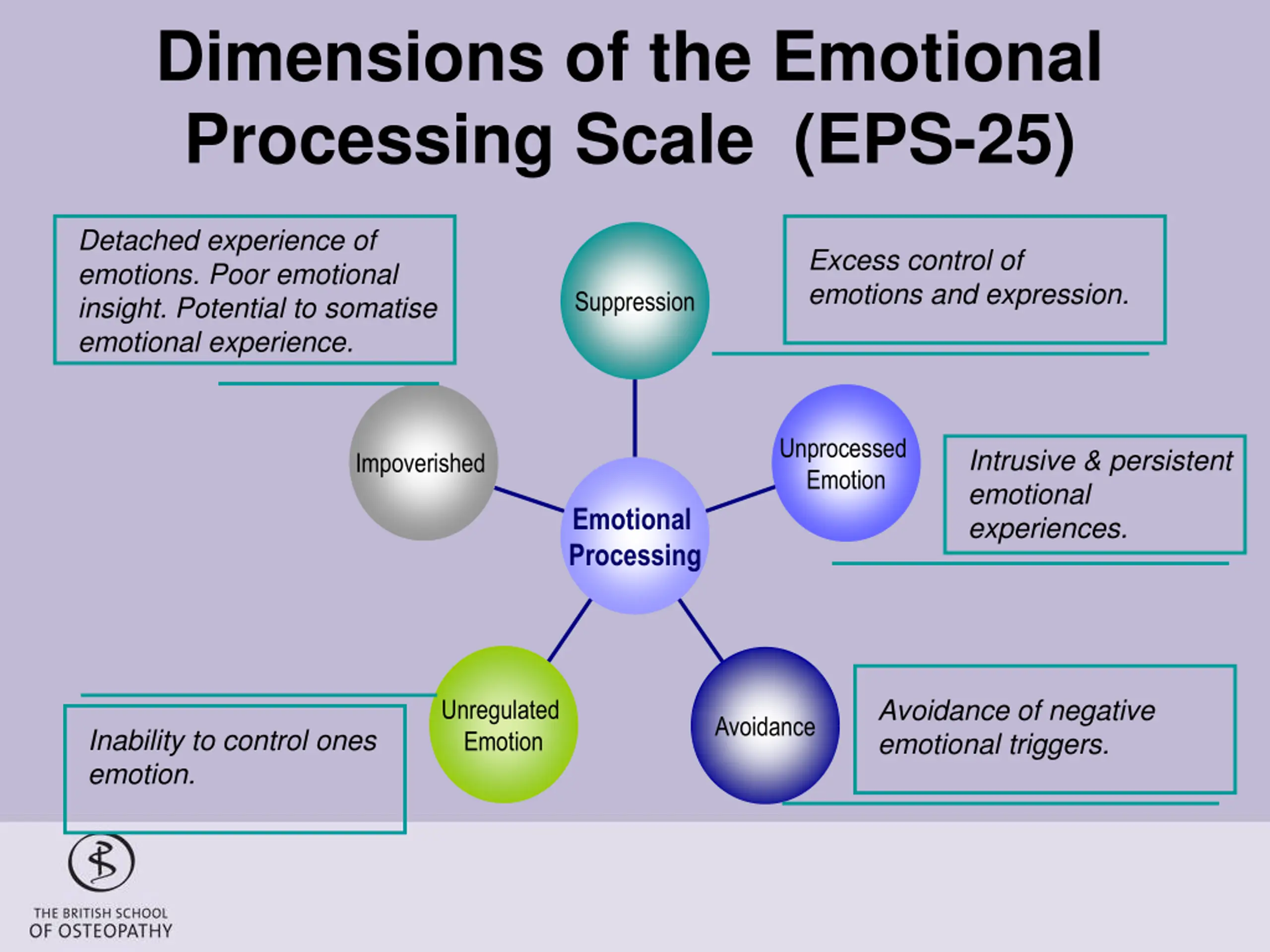 Dimensions of the Emotional Processing Scale (EPS-25) Detached experience of emotions. Poor emotional insight. Potential to somatise emotional experience. Excess control of emotions and expression. Suppression Unprocessed Emotion Intrusive & persistent emotional experiences. Impoverished Emotional Processing Avoidance of negative emotional triggers. Unregulated Emotion Avoidance Inability to control ones emotion.