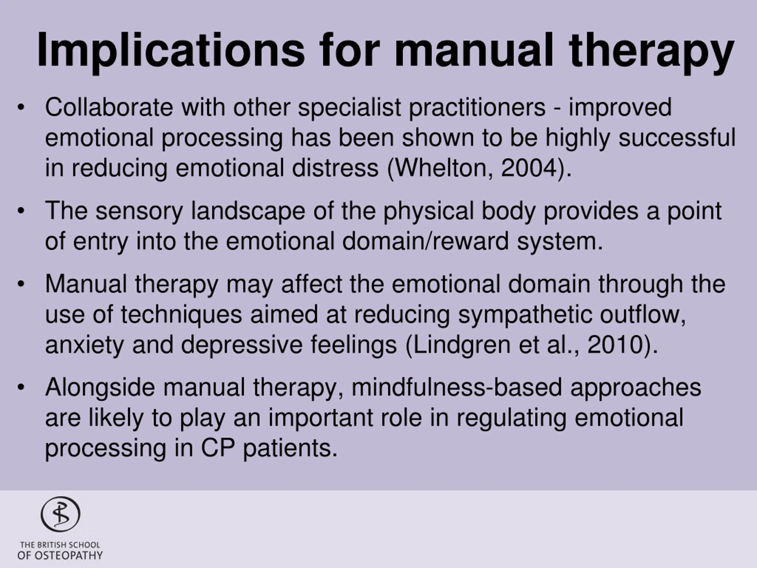 Implications for manual therapy Collaborate with other specialist practitioners - improved emotional processing has been shown to be highly successful in reducing emotional distress (Whelton, 2004). The sensory landscape of the physical body provides a point of entry into the emotional domain/reward system. Manual therapy may affect the emotional domain through the use of techniques aimed at reducing sympathetic outflow, anxiety and depressive feelings (Lindgren et al., 2010). Alongside manual therapy, mindfulness-based approaches are likely to play an important role in regulating emotional processing in CP patients.