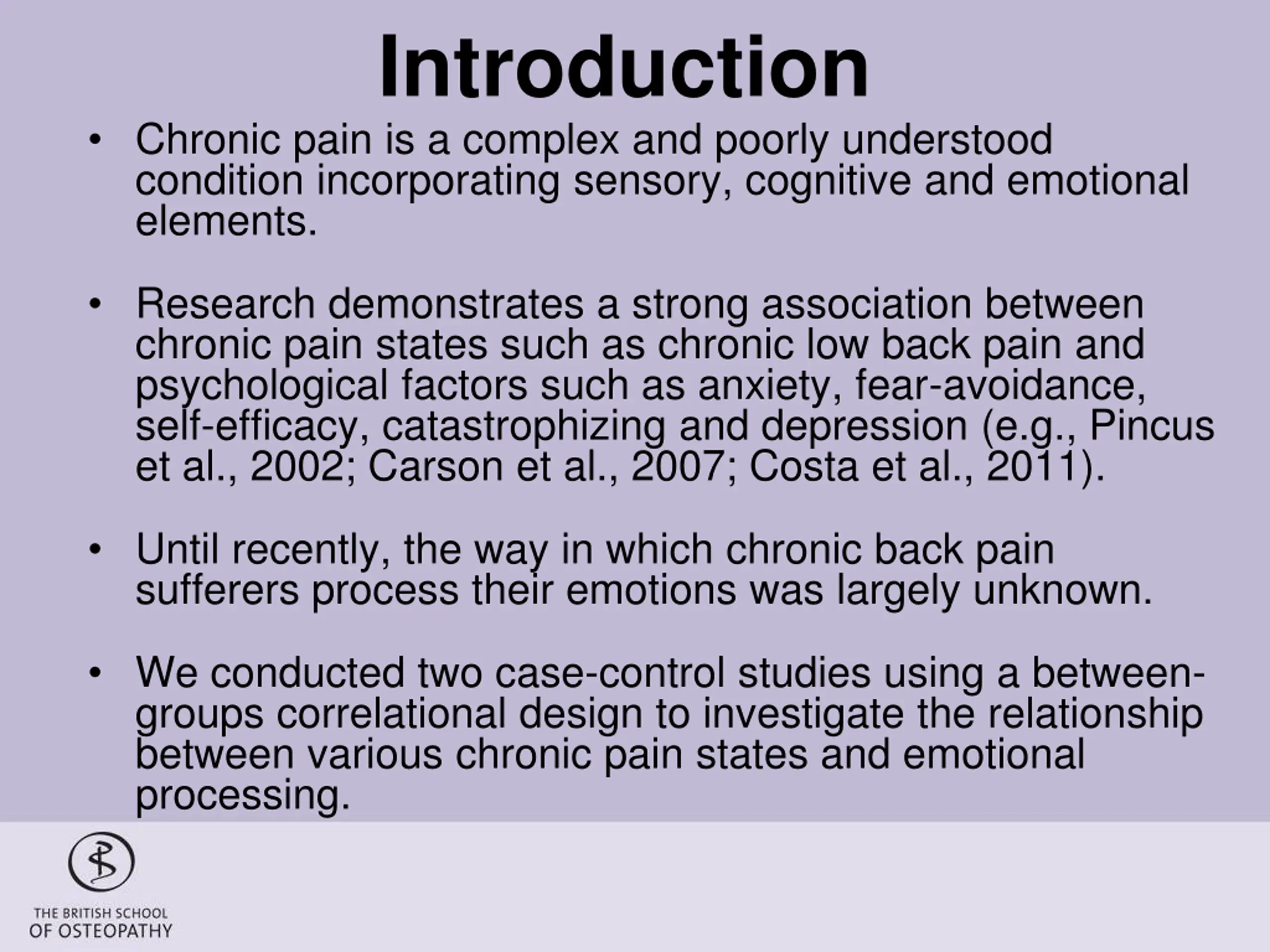 Introduction Chronic pain is a complex and poorly understood condition incorporating sensory, cognitive and emotional elements. Research demonstrates a strong association between chronic pain states such as chronic low back pain and psychological factors such as anxiety, fear-avoidance, self-efficacy, catastrophizing and depression (e.g., Pincus et al., 2002; Carson et al., 2007; Costa et al., 2011). Until recently, the way in which chronic back pain sufferers process their emotions was largely unknown. We conducted two case-control studies using a between- groups correlational design to investigate the relationship between various chronic pain states and emotional processing.