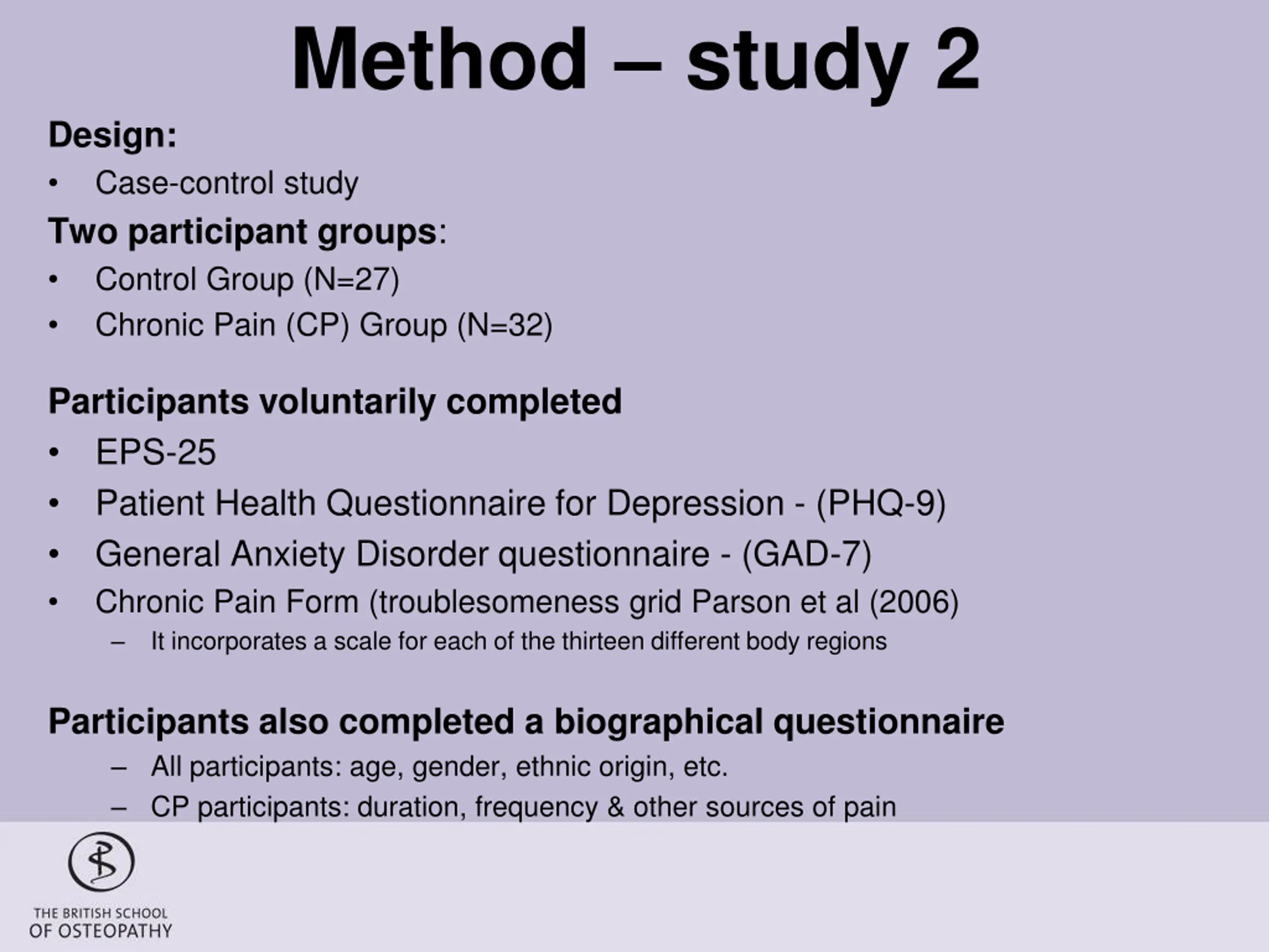 Method study 2 Design: Case-control study Two participant groups: Control Group (N=27) Chronic Pain (CP) Group (N=32) Participants voluntarily completed EPS-25 Patient Health Questionnaire for Depression - (PHQ-9) General Anxiety Disorder questionnaire - (GAD-7) Chronic Pain Form (troublesomeness grid Parson et al (2006) It incorporates a scale for each of the thirteen different body regions Participants also completed a biographical questionnaire All participants: age, gender, ethnic origin, etc. CP participants: duration, frequency & other sources of pain