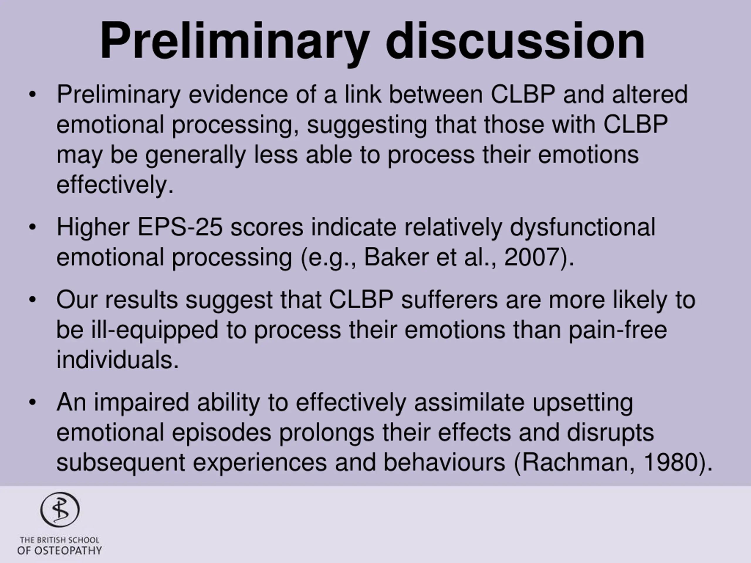 Preliminary discussion Preliminary evidence of a link between CLBP and altered emotional processing, suggesting that those with CLBP may be generally less able to process their emotions effectively. Higher EPS-25 scores indicate relatively dysfunctional emotional processing (e.g., Baker et al., 2007). Our results suggest that CLBP sufferers are more likely to be ill-equipped to process their emotions than pain-free individuals. An impaired ability to effectively assimilate upsetting emotional episodes prolongs their effects and disrupts subsequent experiences and behaviours (Rachman, 1980).