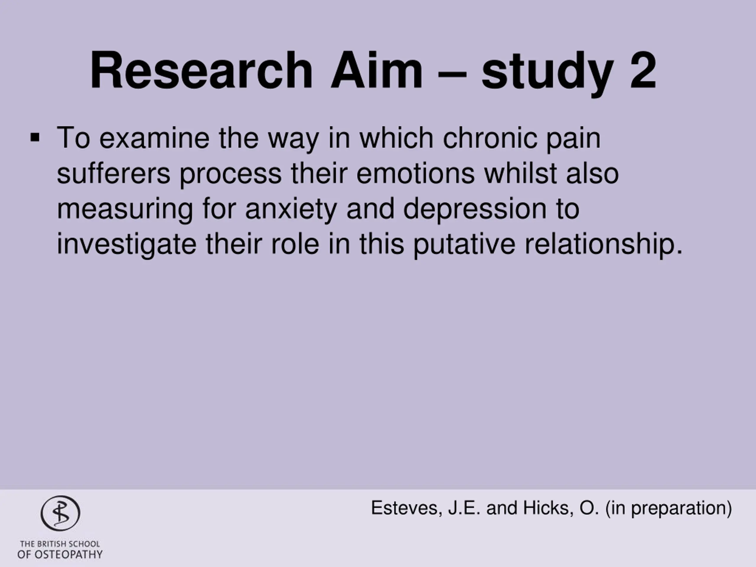 Research Aim study 2 To examine the way in which chronic pain sufferers process their emotions whilst also measuring for anxiety and depression to investigate their role in this putative relationship. Esteves, J.E. and Hicks, O. (in preparation)