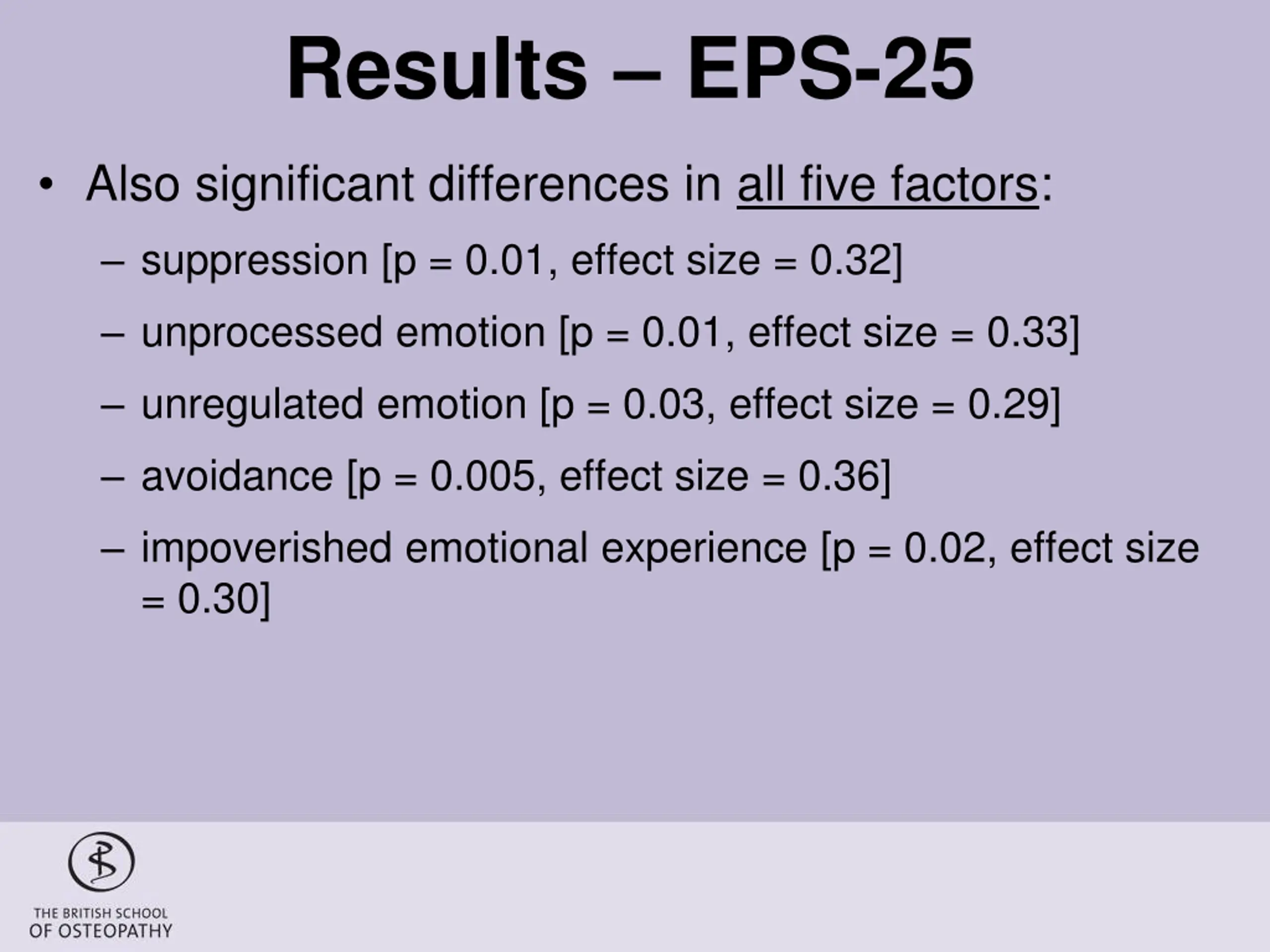 Results EPS-25 Also significant differences in all five factors: suppression [p = 0.01, effect size = 0.32] unprocessed emotion [p = 0.01, effect size = 0.33] unregulated emotion [p = 0.03, effect size = 0.29] avoidance [p = 0.005, effect size = 0.36] impoverished emotional experience [p = 0.02, effect size = 0.30]
