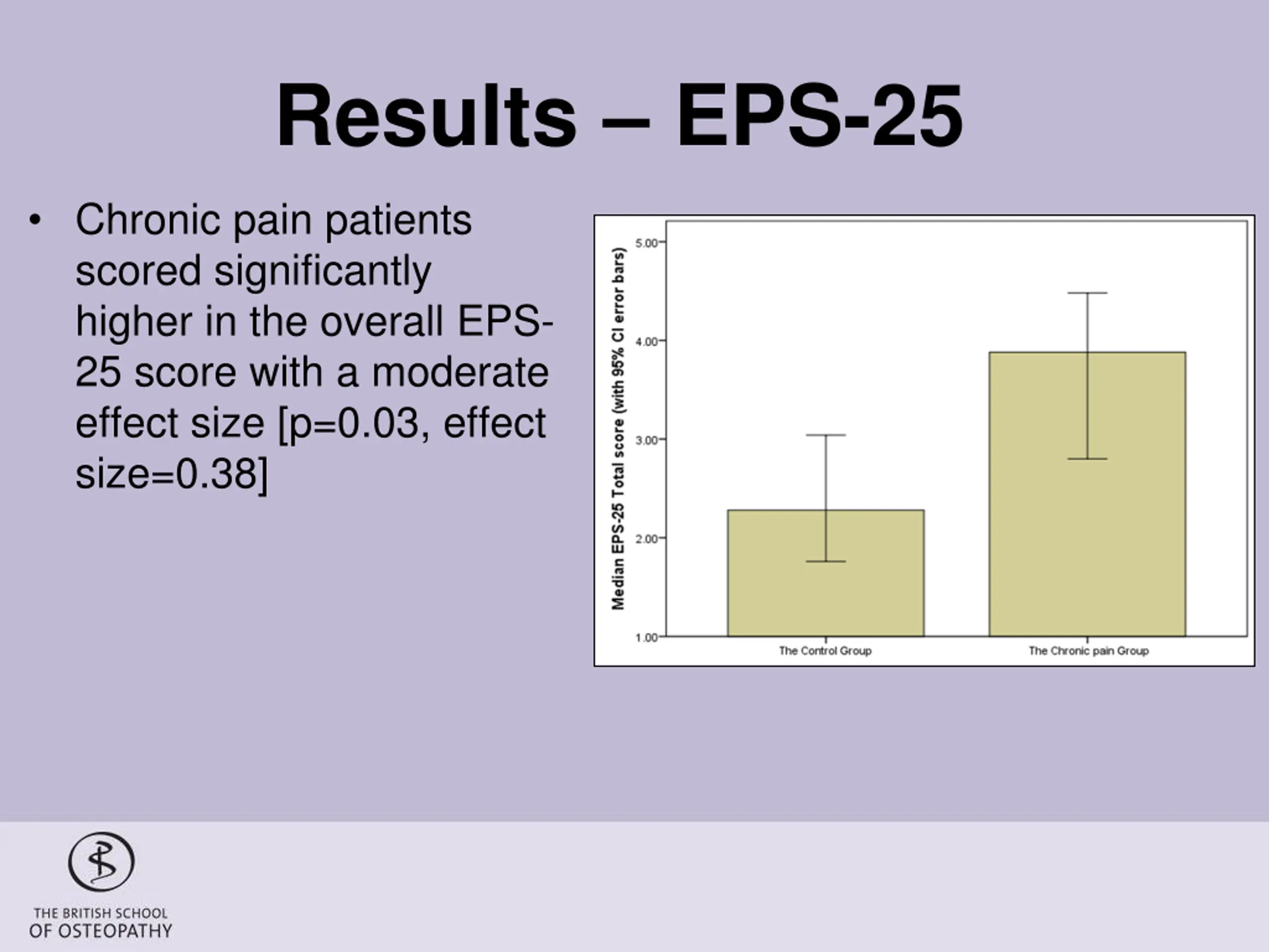 Results EPS-25 Chronic pain patients scored significantly higher in the overall EPS- 25 score with a moderate effect size [p=0.03, effect size=0.38]