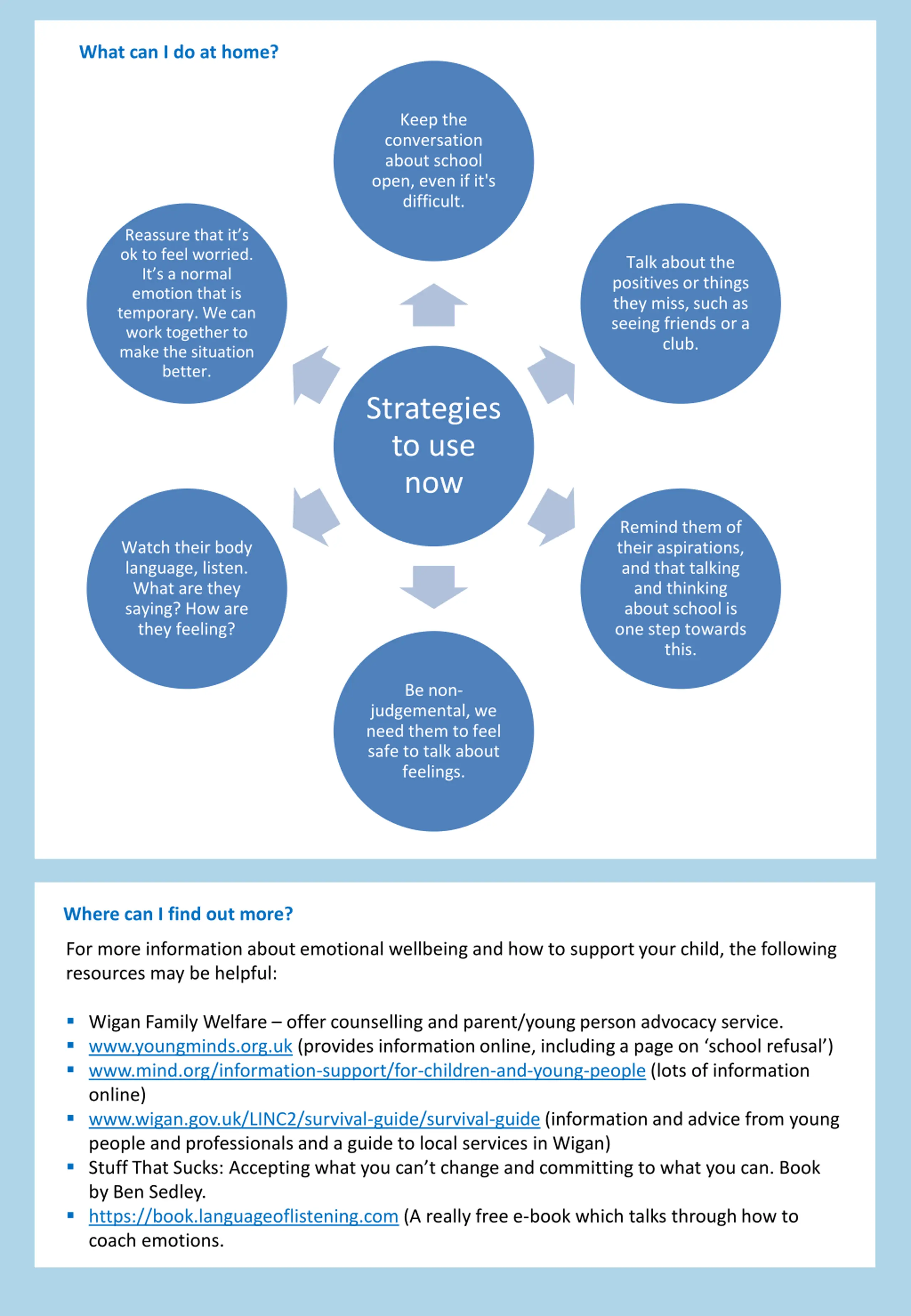 What can I do at home? Keep the conversation about school open, even if it's difficult. Reassure that it s ok to feel worried. It s a normal emotion that is temporary. We can work together to make the situation better. Talk about the positives or things they miss, such as seeing friends or a club. Strategies to use now Remind them of their aspirations, and that talking and thinking about school is one step towards this. Watch their body language, listen. What are they saying? How are they feeling? Be non- judgemental, we need them to feel safe to talk about feelings. Where can I find out more? For more information about emotional wellbeing and how to support your child, the following resources may be helpful: Wigan Family Welfare offer counselling and parent/young person advocacy service. www.youngminds.org.uk (provides information online, including a page on school refusal ) www.mind.org/information-support/for-children-and-young-people (lots of information online) www.wigan.gov.uk/LINC2/survival-guide/survival-guide (information and advice from young people and professionals and a guide to local services in Wigan) Stuff That Sucks: Accepting what you can t change and committing to what you can. Book by Ben Sedley. https://book.languageoflistening.com (A really free e-book which talks through how to coach emotions.