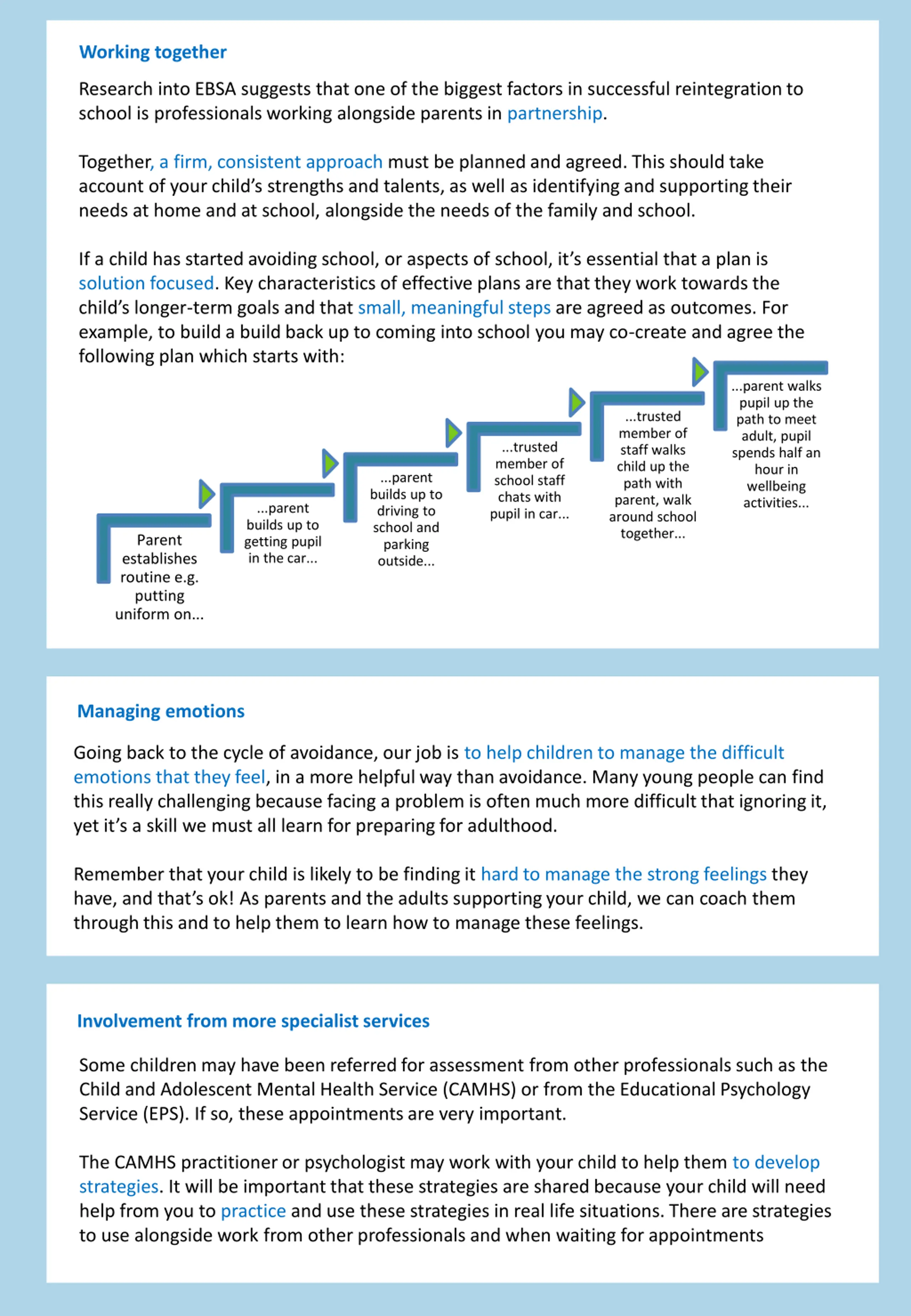 Working together Research into EBSA suggests that one of the biggest factors in successful reintegration to school is professionals working alongside parents in partnership. Together, a firm, consistent approach must be planned and agreed. This should take account of your child s strengths and talents, as well as identifying and supporting their needs at home and at school, alongside the needs of the family and school. If a child has started avoiding school, or aspects of school, it s essential that a plan is solution focused. Key characteristics of effective plans are that they work towards the child s longer-term goals and that small, meaningful steps are agreed as outcomes. For example, to build a build back up to coming into school you may co-create and agree the following plan which starts with: ...parent walks pupil up the path to meet adult, pupil spends half an hour in wellbeing activities... ...trusted member of staff walks child up the path with parent, walk around school together... ...trusted member of school staff chats with pupil in car... ...parent builds up to driving to school and parking outside... ...parent builds up to getting pupil in the car... Parent establishes routine e.g. putting uniform on... Managing emotions Going back to the cycle of avoidance, our job is to help children to manage the difficult emotions that they feel, in a more helpful way than avoidance. Many young people can find this really challenging because facing a problem is often much more difficult that ignoring it, yet it s a skill we must all learn for preparing for adulthood. Going back to the cycle of avoidance, our job is to help children to manage the difficult emotions that they feel, in a more helpful way than avoidance. Many young people can find this really Remember that your child is likely to be finding it hard to manage the strong feelings they have, and that s ok! As parents and the adults supporting your child, we can coach them through this and to help them to learn how to manage these feelings. Involvement from more specialist services Some children may have been referred for assessment from other professionals such as the Child and Adolescent Mental Health Service (CAMHS) or from the Educational Psychology Service (EPS). If so, these appointments are very important. Going back to the cycle of avoidance, our job is to help children to manage the difficult emotions that they feel, in a more helpful way than avoidance. Many young people can find this really strategies. It will be important that these strategies are shared because your child will need help from you to practice and use these strategies in real life situations. There are strategies to use alongside work from other professionals and when waiting for appointments The CAMHS practitioner or psychologist may work with your child to help them to develop