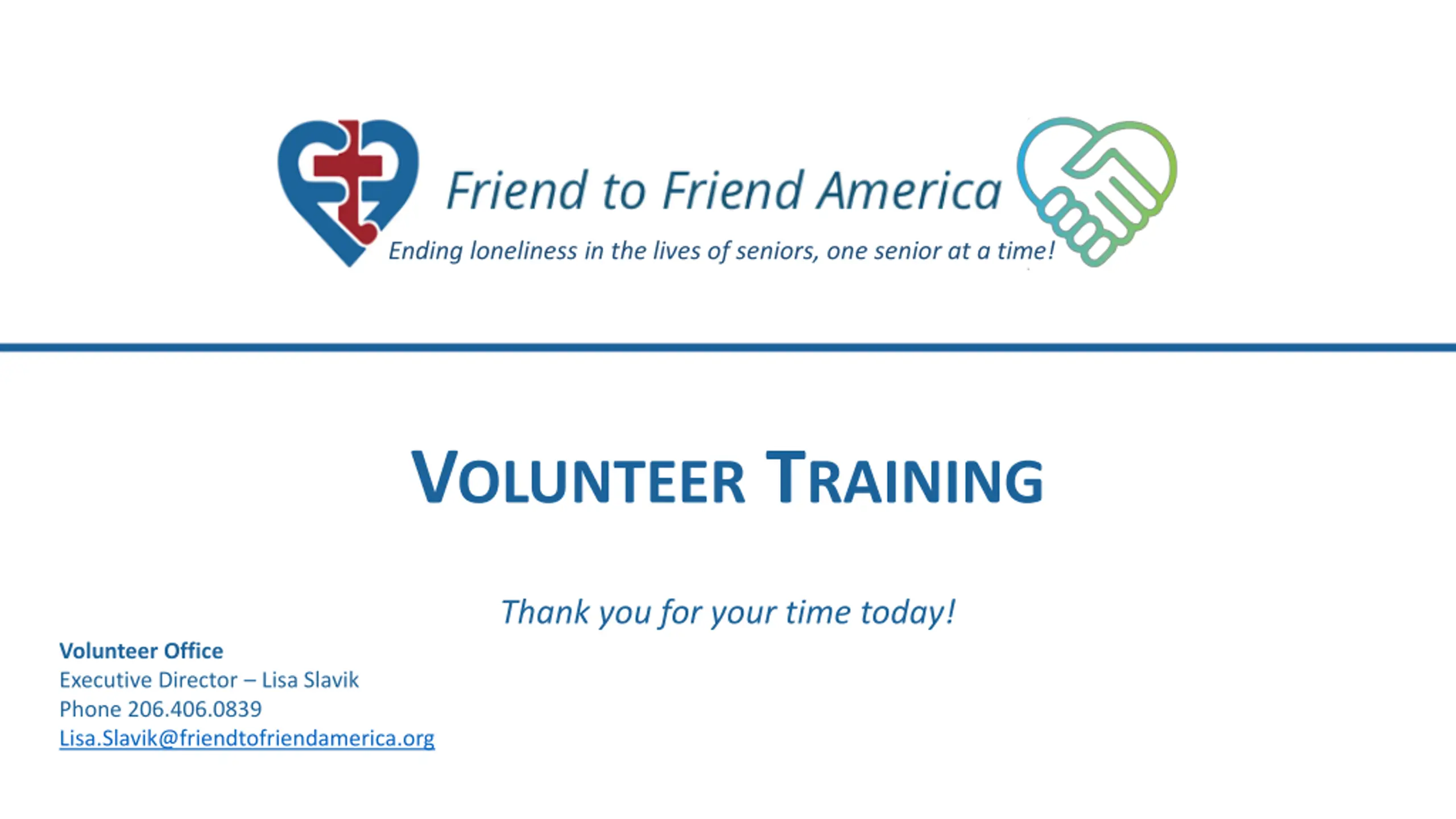 Ending loneliness in the lives of seniors, one senior at a time! VOLUNTEER TRAINING Thank you for your time today! Volunteer Office Executive Director Lisa Slavik Phone 206.406.0839 Lisa.Slavik@friendtofriendamerica.org