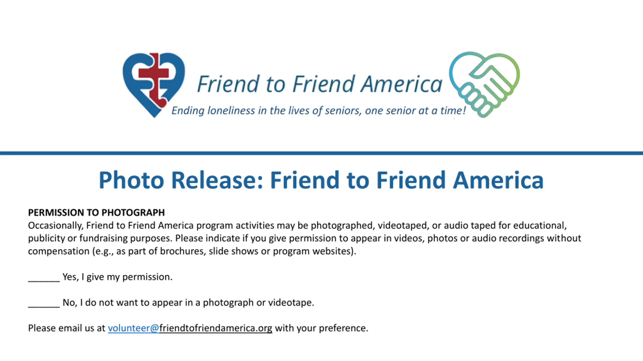 Ending loneliness in the lives of seniors, one senior at a time! Photo Release: Friend to Friend America PERMISSION TO PHOTOGRAPH Occasionally, Friend to Friend America program activities may be photographed, videotaped, or audio taped for educational, publicity or fundraising purposes. Please indicate if you give permission to appear in videos, photos or audio recordings without compensation (e.g., as part of brochures, slide shows or program websites). ______ Yes, I give my permission. ______ No, I do not want to appear in a photograph or videotape. Please email us at volunteer@friendtofriendamerica.org with your preference.
