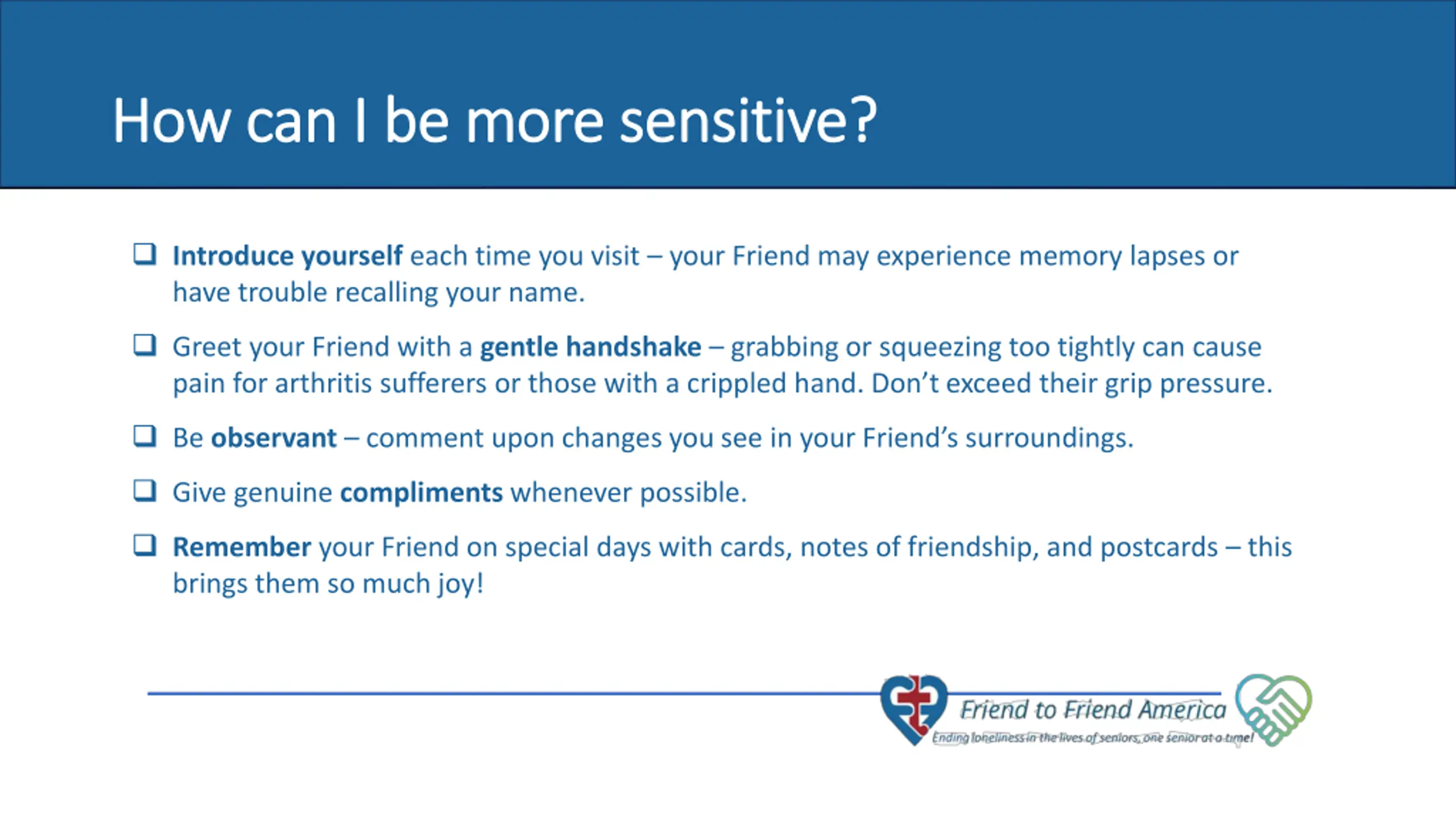 How can I be more sensitive? How can I be more sensitive? Introduce yourself each time you visit your Friend may experience memory lapses or have trouble recalling your name. Greet your Friend with a gentle handshake grabbing or squeezing too tightly can cause pain for arthritis sufferers or those with a crippled hand. Don t exceed their grip pressure. Be observant comment upon changes you see in your Friend s surroundings. 7 of 10 seniors never have a visitor. Give genuine compliments whenever possible. Remember your Friend on special days with cards, notes of friendship, and postcards this brings them so much joy!