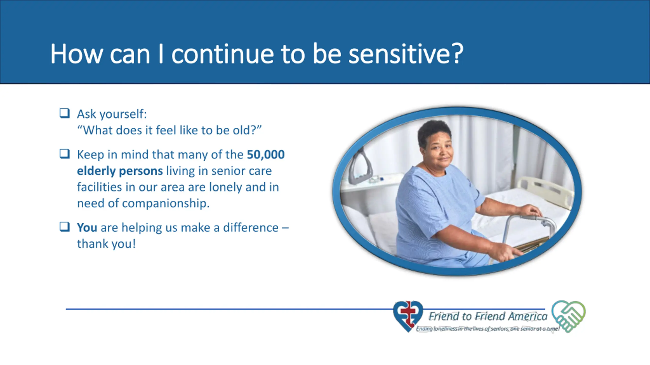 How can I continue to be sensitive? How can I continue to be sensitive? Ask yourself: What does it feel like to be old? Keep in mind that many of the 50,000 elderly persons living in senior care facilities in our area are lonely and in need of companionship. 7 of 10 seniors never have a visitor. You are helping us make a difference thank you!