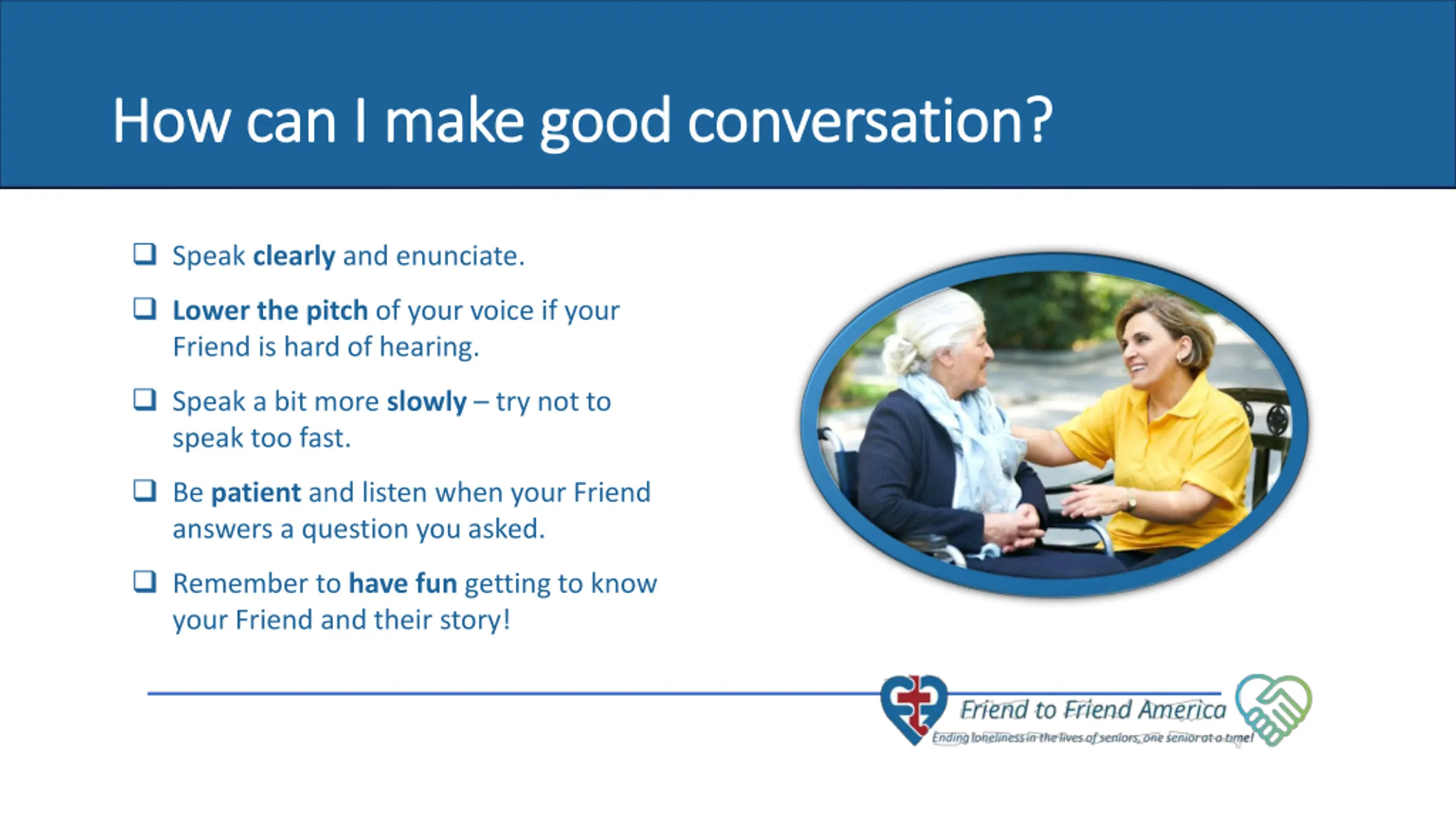 How can I make good conversation? How can I make good conversation? Speak clearly and enunciate. Lower the pitch of your voice if your Friend is hard of hearing. Speak a bit more slowly try not to speak too fast. 7 of 10 seniors never have a visitor. Be patient and listen when your Friend answers a question you asked. Remember to have fun getting to know your Friend and their story!