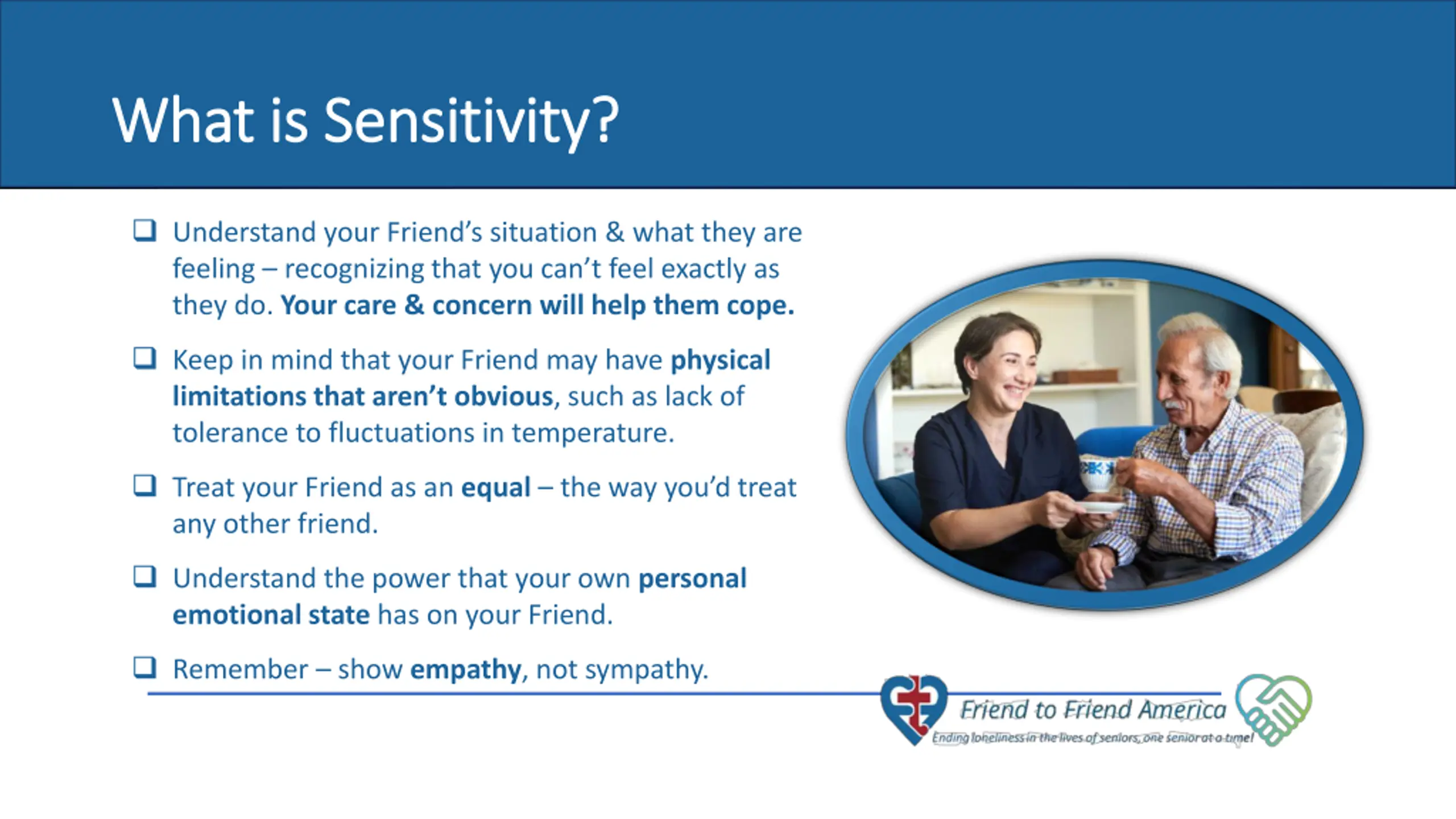 What is Sensitivity? What is Sensitivity? Understand your Friend s situation & what they are feeling recognizing that you can t feel exactly as they do. Your care & concern will help them cope. Keep in mind that your Friend may have physical limitations that aren t obvious, such as lack of tolerance to fluctuations in temperature. 7 of 10 seniors never have a visitor. Treat your Friend as an equal the way you d treat any other friend. Understand the power that your own personal emotional state has on your Friend. Remember show empathy, not sympathy.