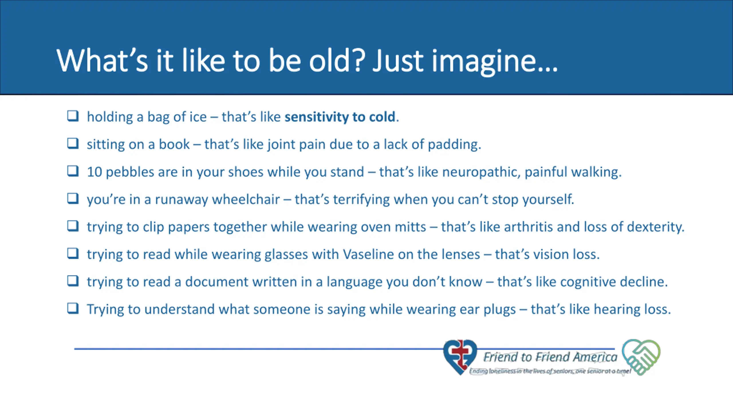 Whats it like to be old? Just imagine What s it like to be old? Just imagine holding a bag of ice that s like sensitivity to cold. sitting on a book that s like joint pain due to a lack of padding. 10 pebbles are in your shoes while you stand that s like neuropathic, painful walking. you re in a runaway wheelchair that s terrifying when you can t stop yourself. trying to clip papers together while wearing oven mitts that s like arthritis and loss of dexterity. 7 of 10 seniors never have a visitor. trying to read while wearing glasses with Vaseline on the lenses that s vision loss. trying to read a document written in a language you don t know that s like cognitive decline. Trying to understand what someone is saying while wearing ear plugs that s like hearing loss.