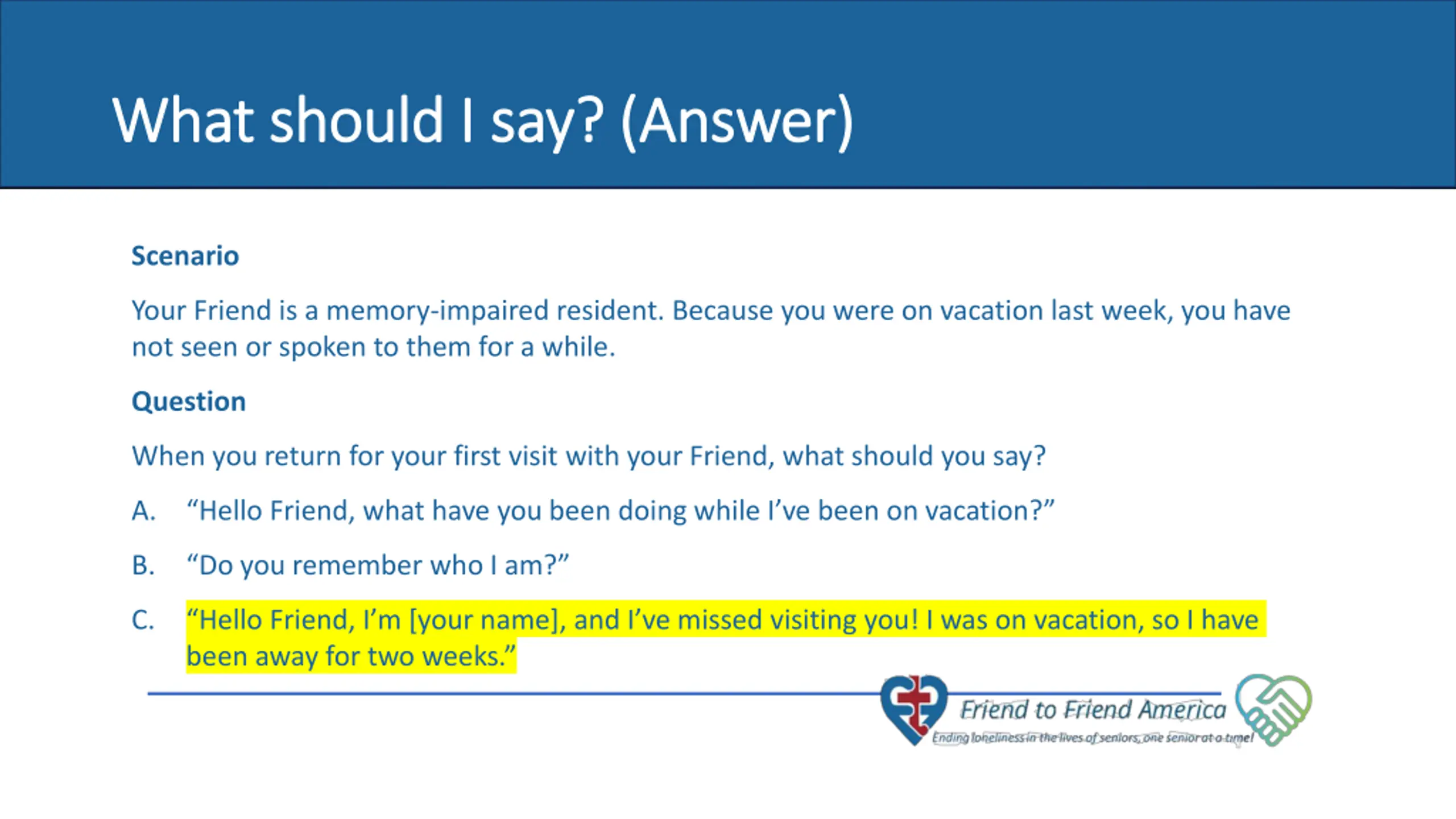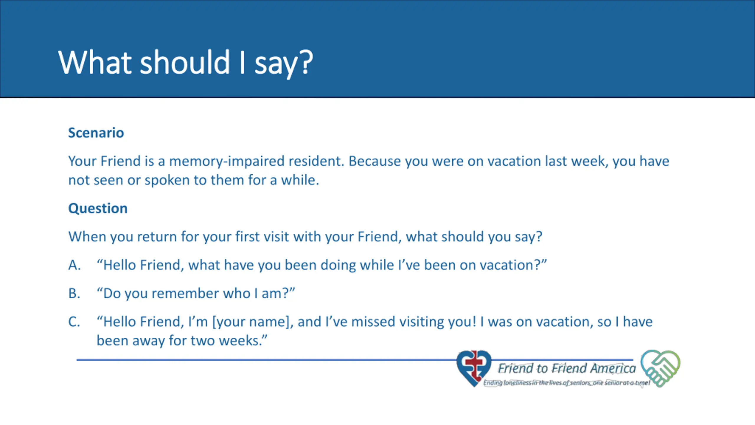 What should I say? (Answer) What should I say? (Answer) Scenario Your Friend is a memory-impaired resident. Because you were on vacation last week, you have not seen or spoken to them for a while. Question 7 of 10 seniors never have a visitor. A. Hello Friend, what have you been doing while I ve been on vacation? When you return for your first visit with your Friend, what should you say? B. Do you remember who I am? C. Hello Friend, I m [your name], and I ve missed visiting you! I was on vacation, so I have been away for two weeks.