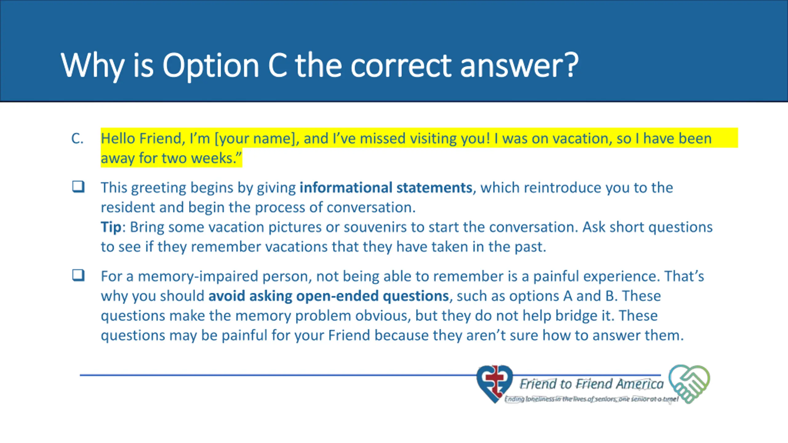 Why is Option C the correct answer? Why is Option C the correct answer? C. Hello Friend, I m [your name], and I ve missed visiting you! I was on vacation, so I have been away for two weeks. This greeting begins by giving informational statements, which reintroduce you to the resident and begin the process of conversation. Tip: Bring some vacation pictures or souvenirs to start the conversation. Ask short questions to see if they remember vacations that they have taken in the past. 7 of 10 seniors never have a visitor. For a memory-impaired person, not being able to remember is a painful experience. That s why you should avoid asking open-ended questions, such as options A and B. These questions make the memory problem obvious, but they do not help bridge it. These questions may be painful for your Friend because they aren t sure how to answer them.