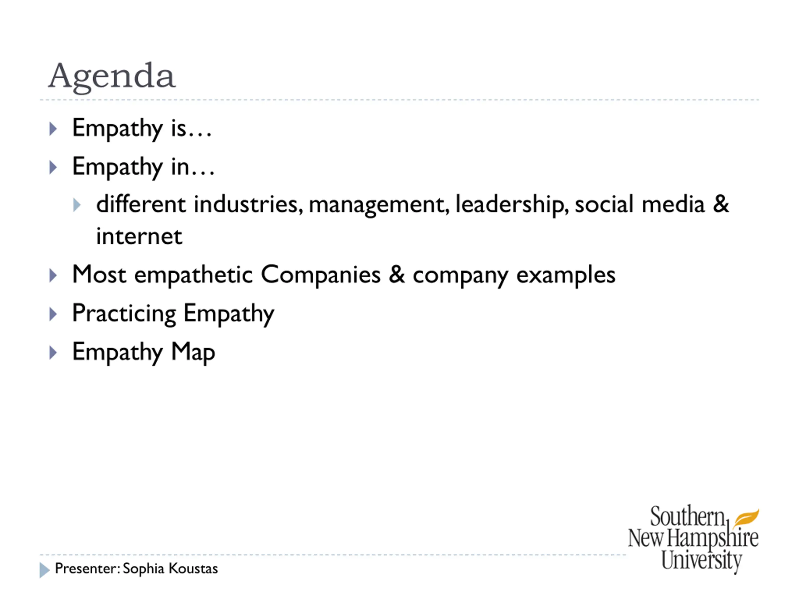 Agenda Empathy is Empathy in different industries, management, leadership, social media & internet Most empathetic Companies & company examples Practicing Empathy Empathy Map Presenter: Sophia Koustas