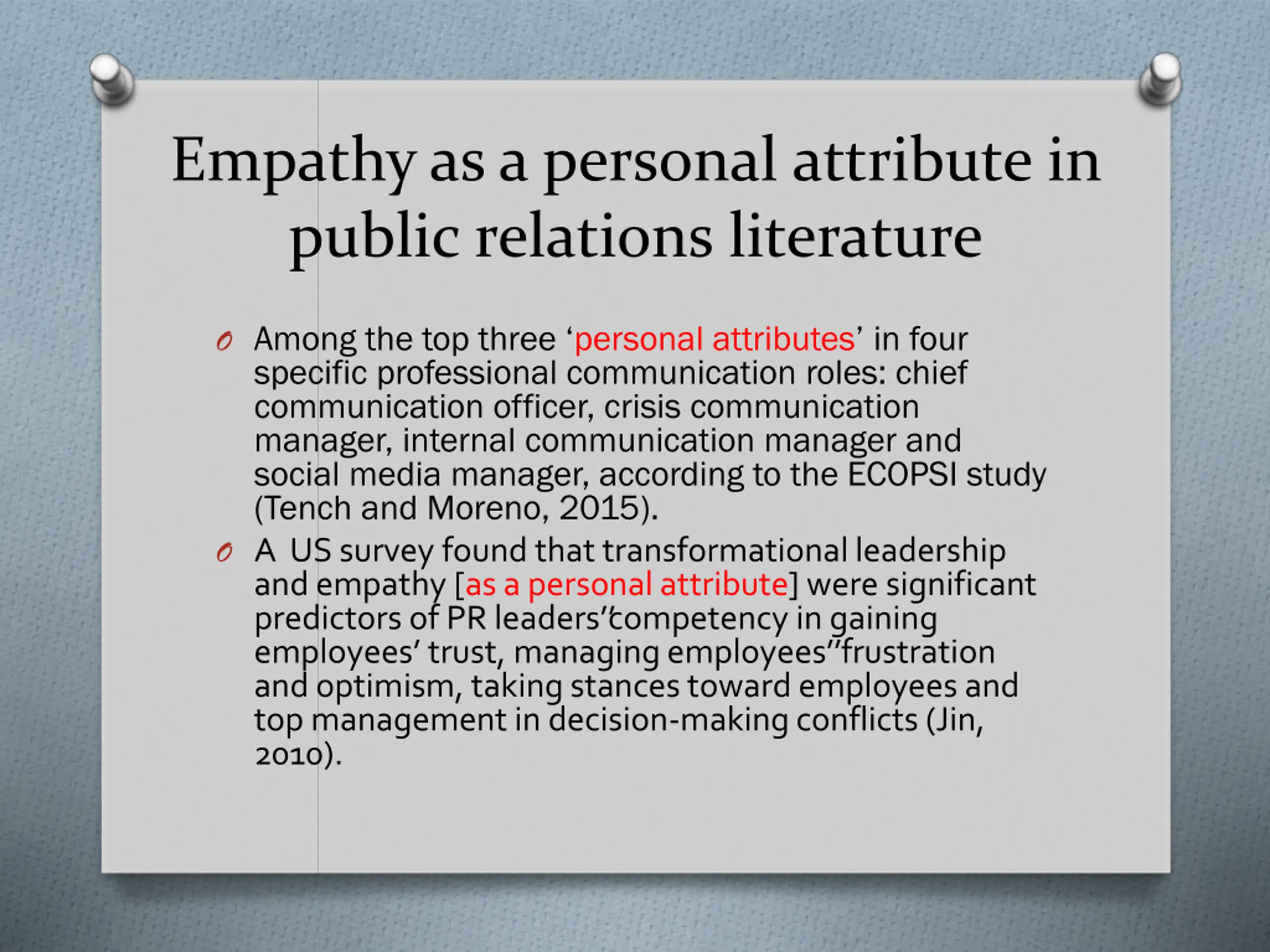 Empathy as a personal attribute in public relations literature O Among the top three personal attributes in four specific professional communication roles: chief communication officer, crisis communication manager, internal communication manager and social media manager, according to the ECOPSI study (Tench and Moreno, 2015). O A US survey found that transformational leadership and empathy [as a personal attribute] were significant predictors of PR leaders competencyin gaining employees trust, managing employees frustration and optimism, taking stances toward employees and top management in decision-making conflicts (Jin, 2010).