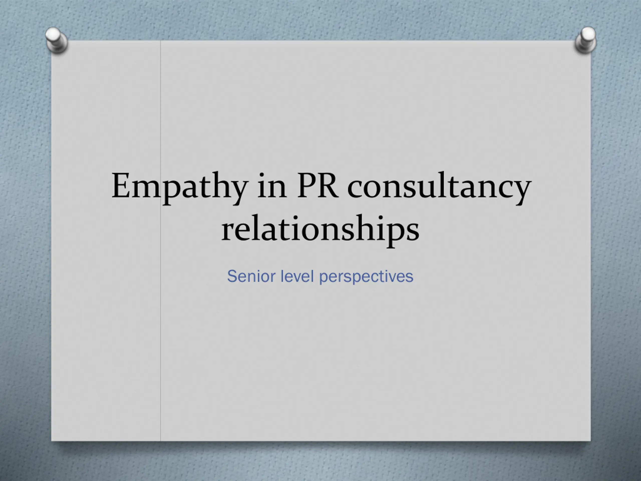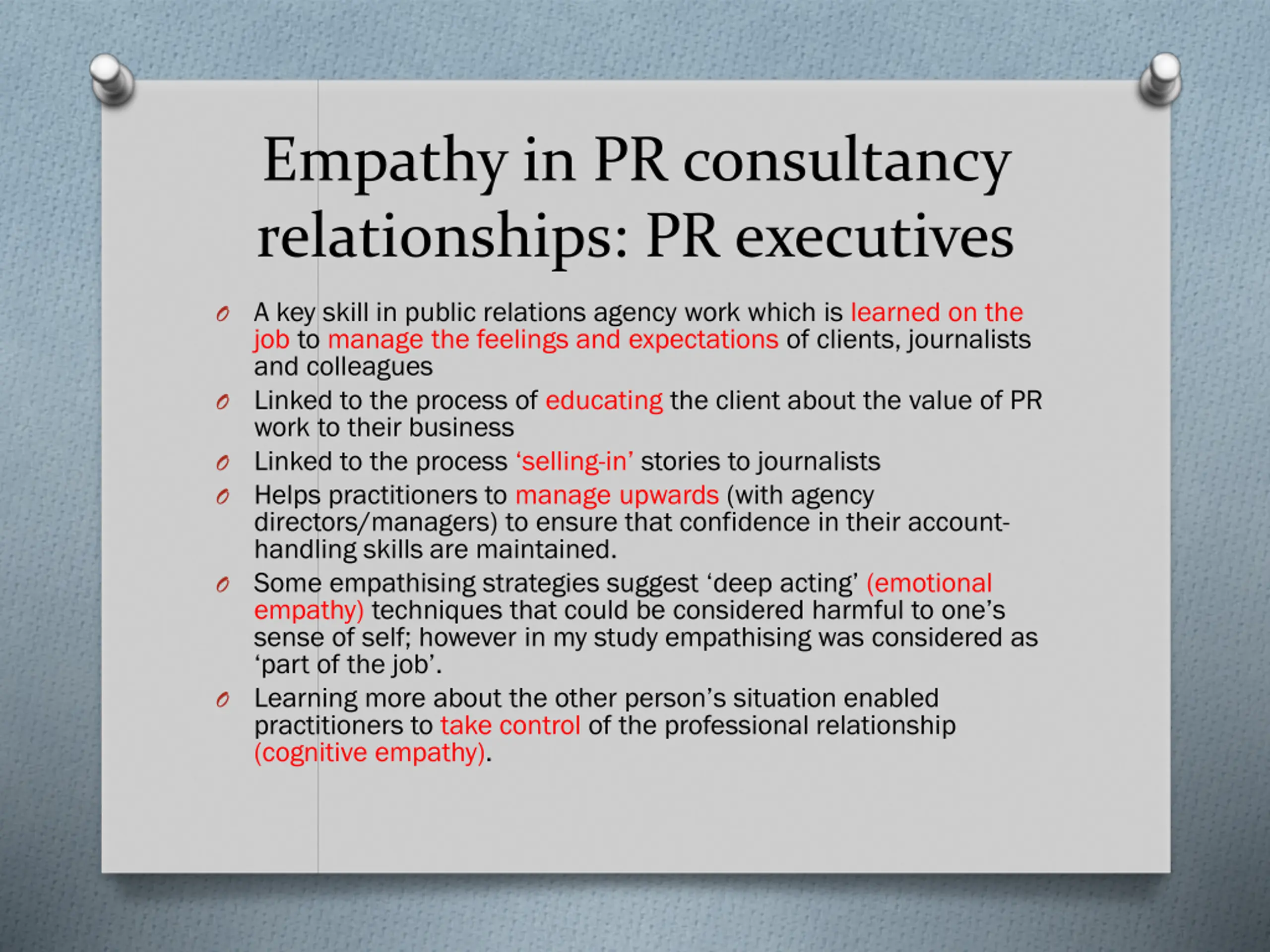 Empathy in PR consultancy relationships: PR executives O A key skill in public relations agency work which is learned on the job to manage the feelings and expectations of clients, journalists and colleagues O Linked to the process of educating the client about the value of PR work to their business O Linked to the process selling-in stories to journalists O Helps practitioners to manage upwards (with agency directors/managers) to ensure that confidence in their account- handling skills are maintained. O Some empathising strategies suggest deep acting (emotional empathy) techniques that could be considered harmful to one s sense of self; however in my study empathising was considered as part of the job . O Learning more about the other person s situation enabled practitioners to take control of the professional relationship (cognitive empathy).
