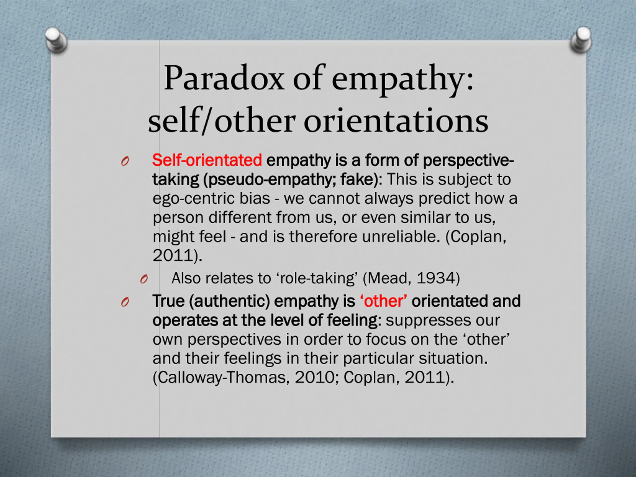 Paradox of empathy: self/other orientations Self Self- -orientated orientated empathy is a form of perspective empathy is a form of perspective- - taking taking (pseudo (pseudo- -empathy; fake) empathy; fake): This is subject to ego-centric bias - we cannot always predict how a person different from us, or even similar to us, might feel - and is therefore unreliable. (Coplan, 2011). Also relates to role-taking (Mead, 1934) True (authentic) empathy True (authentic) empathy is operates at the level of feeling operates at the level of feeling: suppresses our own perspectives in order to focus on the other and their feelings in their particular situation. (Calloway-Thomas, 2010; Coplan, 2011). O O is other other orientated and orientated and O
