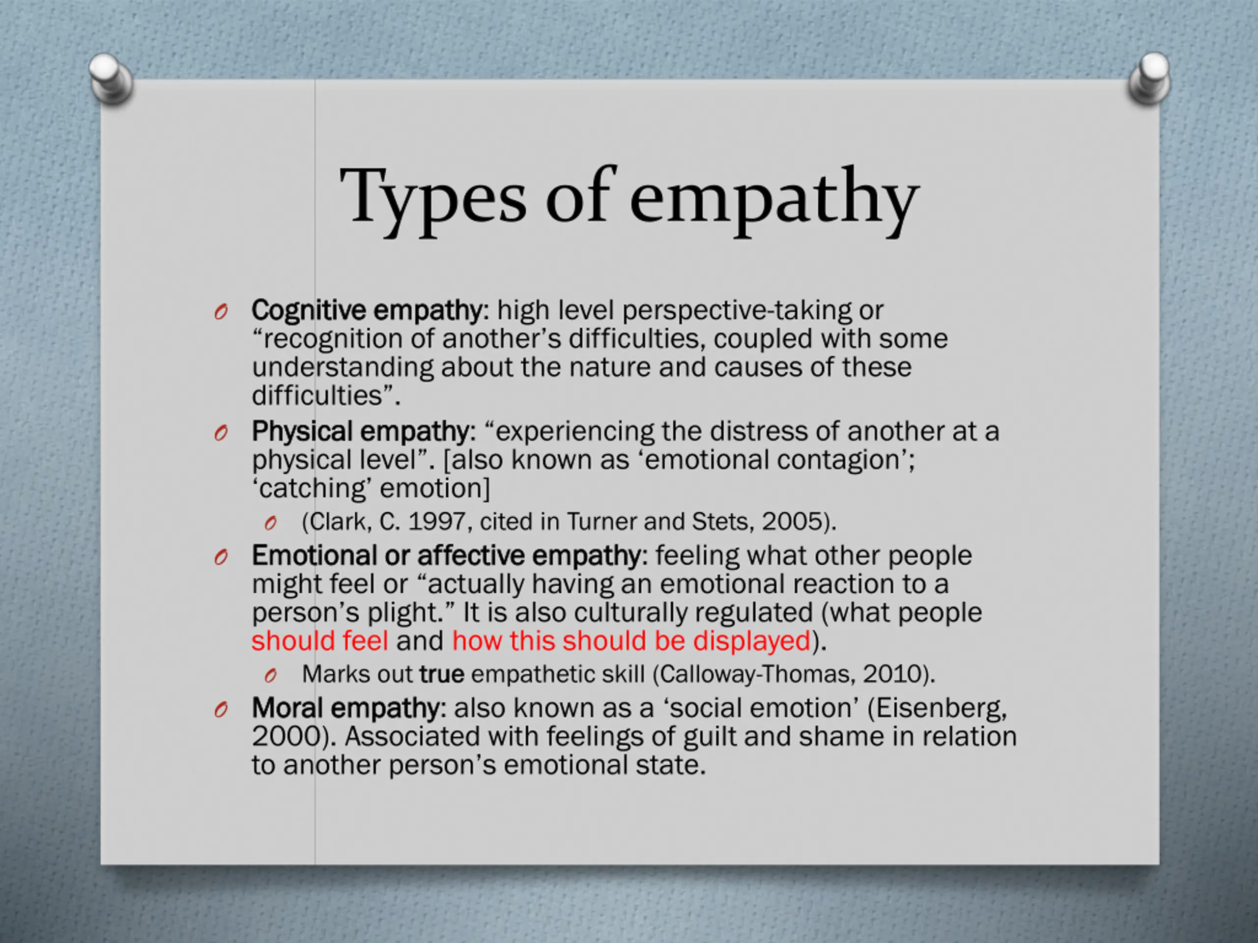 Types of empathy O Cognitive Cognitive empathy recognition of another s difficulties, coupled with some understanding about the nature and causes of these difficulties . O Physical empathy Physical empathy: experiencing the distress of another at a physical level . [also known as emotional contagion ; catching emotion] O (Clark, C. 1997, cited in Turner and Stets, 2005). O Emotional or affective empathy Emotional or affective empathy: feeling what other people might feel or actually having an emotional reaction to a person s plight. It is also culturally regulated (what people should feel and how this should be displayed). O Marks out true true empathetic skill (Calloway-Thomas, 2010). O Moral empathy Moral empathy: also known as a social emotion (Eisenberg, 2000). Associated with feelings of guilt and shame in relation to another person s emotional state. empathy: high level perspective-taking or