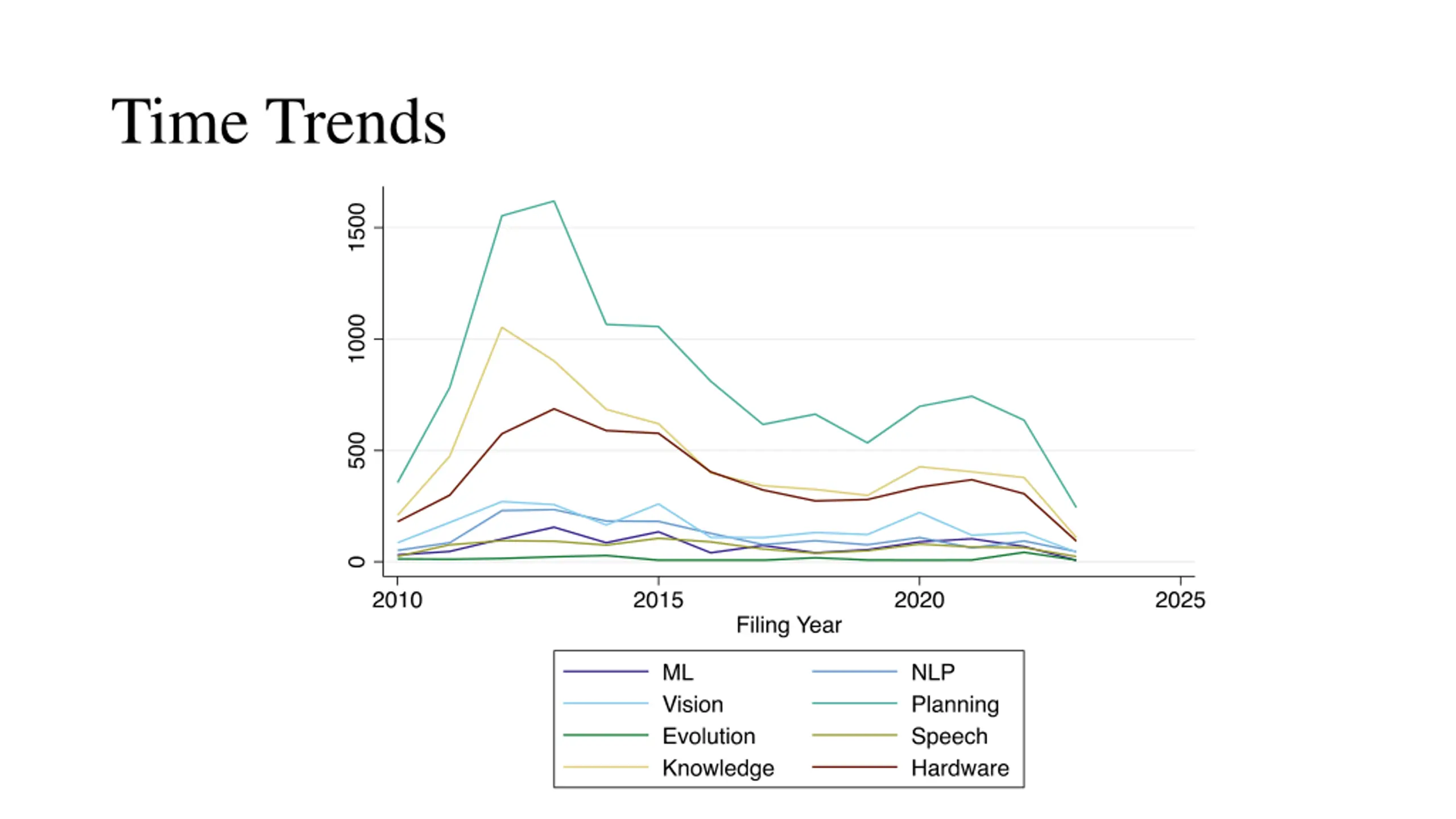 USPTO AI Database (2020) Contain one or more of several AI technology components: machine learning, natural language processing, computer vision, speech, knowledge processing, AI hardware, evolutionary computation, and planning and control) Machine learning (ML) approach that analyzed patent text and citations to identify AI in U.S. patent documents (Abood and Feltenberger 2018; Toole et al. 2020) 1976-2020 and pre-grant publications (PGPubs) published through 2020 AI model re: whether one of the categories based on text of patent, its claims and its citations (backward and forward) 12 million patent documents between 1976-2020 (abstract and claims) and backward and forward citations (US granted patents and apps only) Knowledge processing, and planning and control have lower performance statistics than others 2018: 25% of patents are AI; mostly new entrants Manual process: 4 examiners hand coded 400 documents each from selected group of about 600 documents 668,808 AI patents within 13 million patents