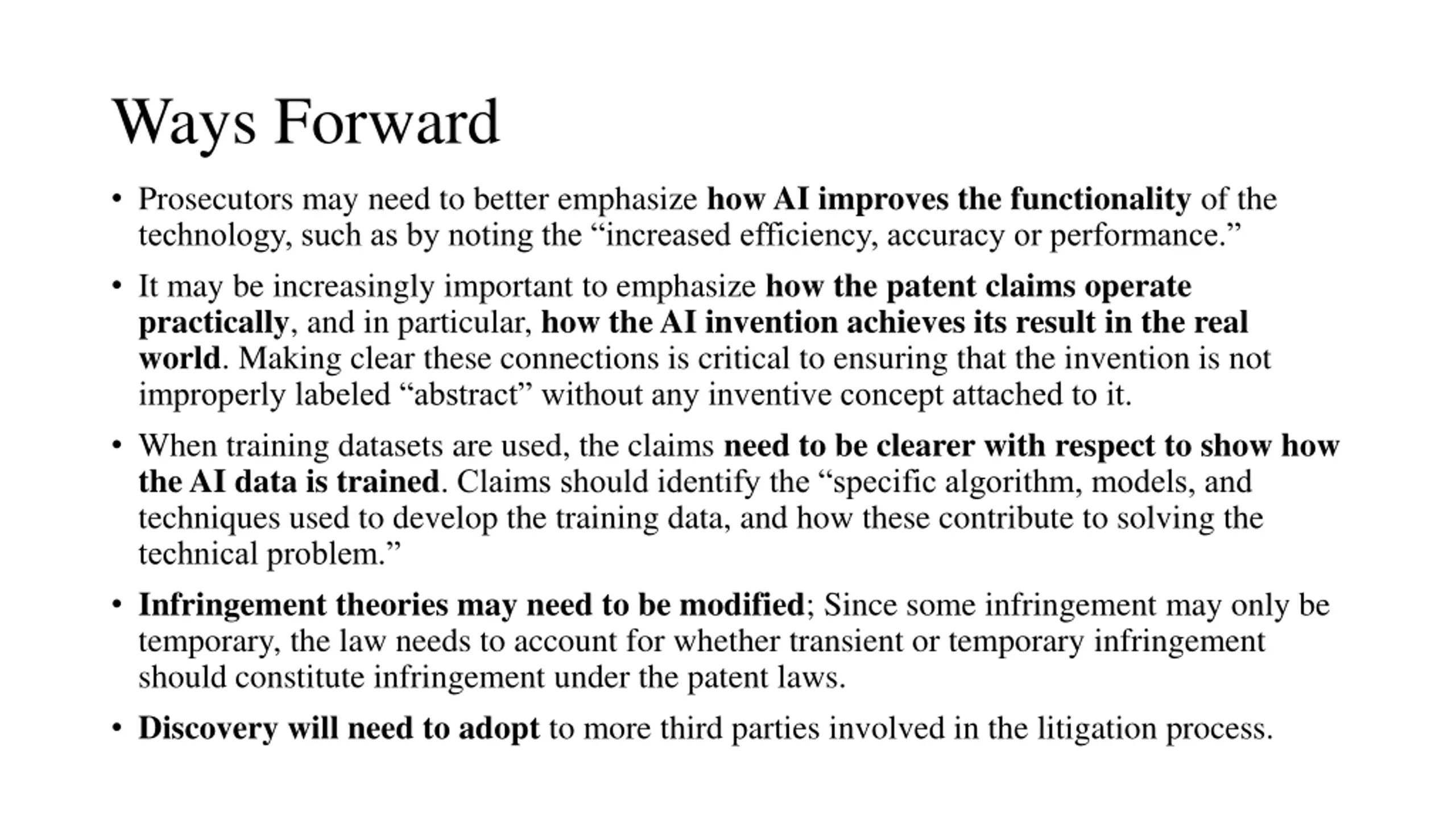 Ways Forward Prosecutors may need to better emphasize how AI improves the functionality of the technology, such as by noting the increased efficiency, accuracy or performance. It may be increasingly important to emphasize how the patent claims operate practically, and in particular, how the AI invention achieves its result in the real world. Making clear these connections is critical to ensuring that the invention is not improperly labeled abstract without any inventive concept attached to it. When training datasets are used, the claims need to be clearer with respect to show how the AI data is trained. Claims should identify the specific algorithm, models, and techniques used to develop the training data, and how these contribute to solving the technical problem. Infringement theories may need to be modified; Since some infringement may only be temporary, the law needs to account for whether transient or temporary infringement should constitute infringement under the patent laws. Discovery will need to adopt to more third parties involved in the litigation process.