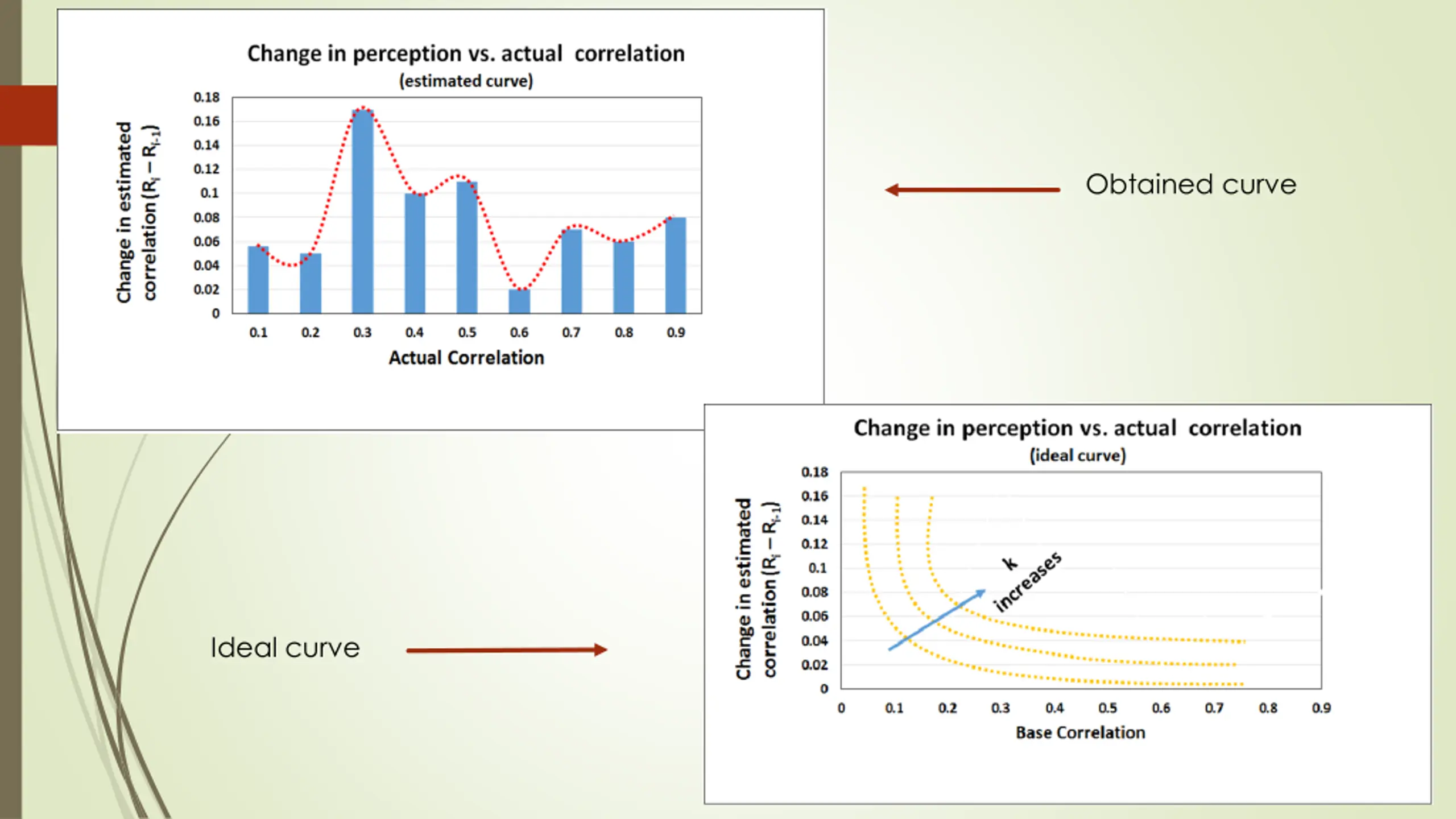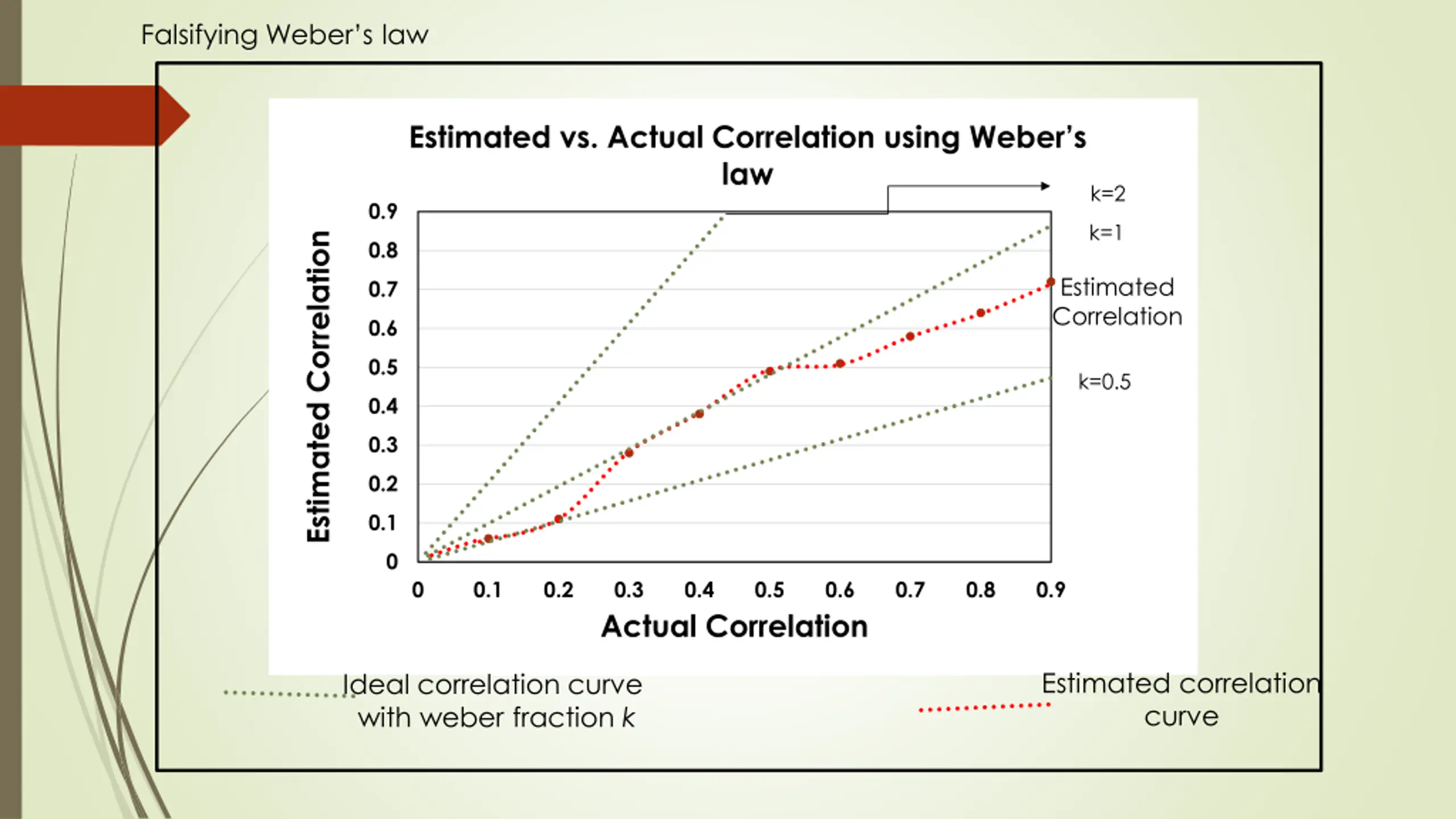 Falsifying Webers law Estimated vs. Actual Correlation using Weber s law k=2 0.9 k=1 Estimated Correlation 0.8 Estimated Correlation 0.7 0.6 0.5 k=0.5 0.4 0.3 0.2 0.1 0 0 0.1 0.2 0.3 Actual Correlation 0.4 0.5 0.6 0.7 0.8 0.9 Estimated correlation curve Ideal correlation curve with weber fraction k