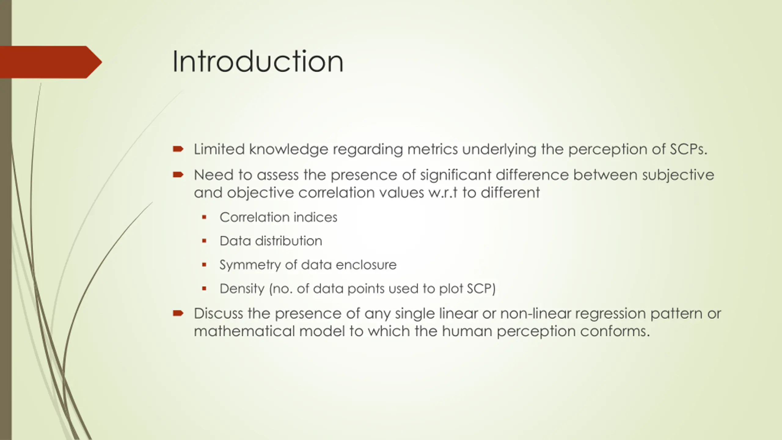 Introduction Limited knowledge regarding metrics underlying the perception of SCPs. Need to assess the presence of significant difference between subjective and objective correlation values w.r.t to different Correlation indices Data distribution Symmetry of data enclosure Density (no. of data points used to plot SCP) Discuss the presence of any single linear or non-linear regression pattern or mathematical model to which the human perception conforms.