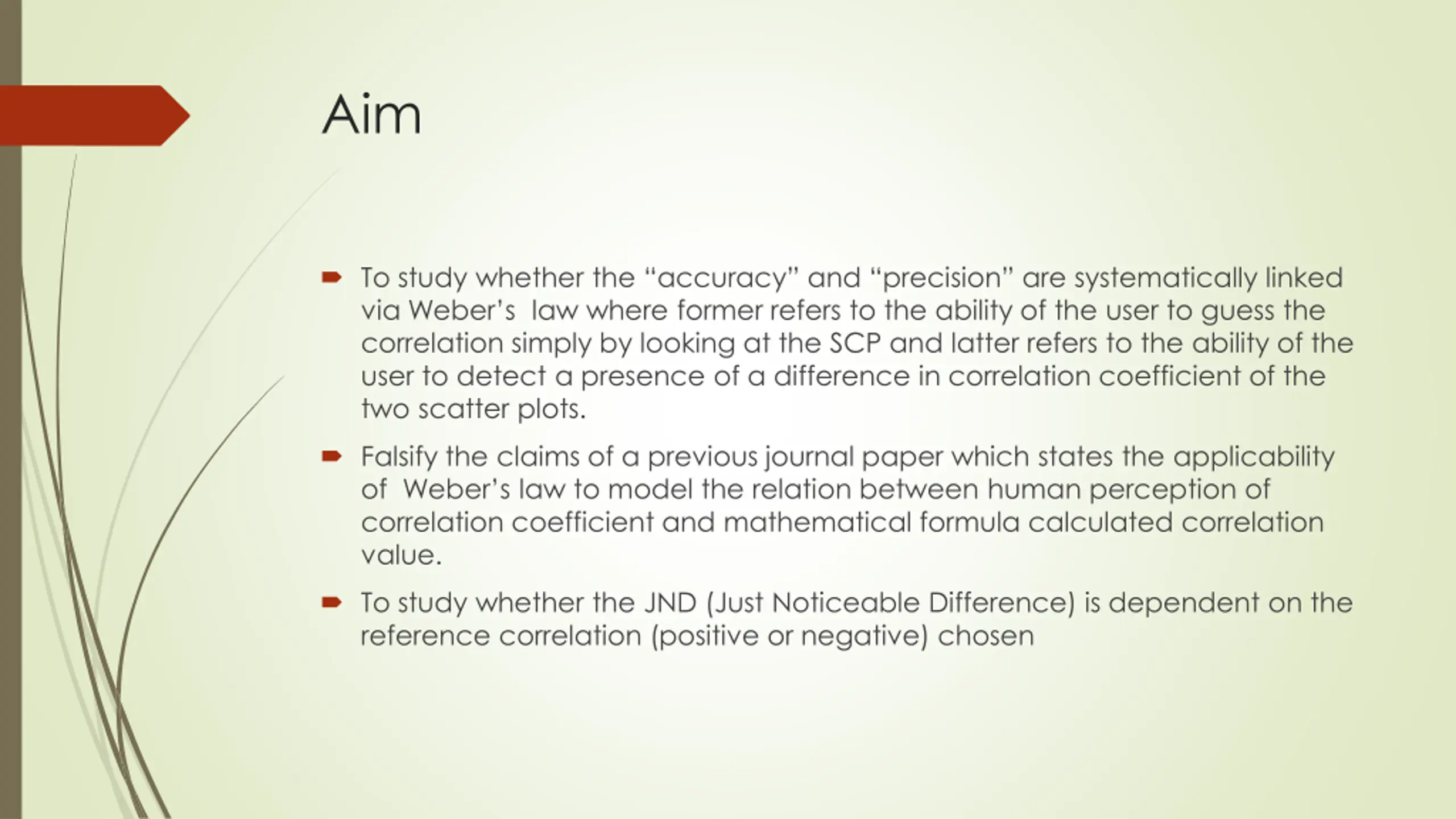 Aim To study whether the accuracy and precision are systematically linked via Weber s law where former refers to the ability of the user to guess the correlation simply by looking at the SCP and latter refers to the ability of the user to detect a presence of a difference in correlation coefficient of the two scatter plots. Falsify the claims of a previous journal paper which states the applicability of Weber s law to model the relation between human perception of correlation coefficient and mathematical formula calculated correlation value. To study whether the JND (Just Noticeable Difference) is dependent on the reference correlation (positive or negative) chosen