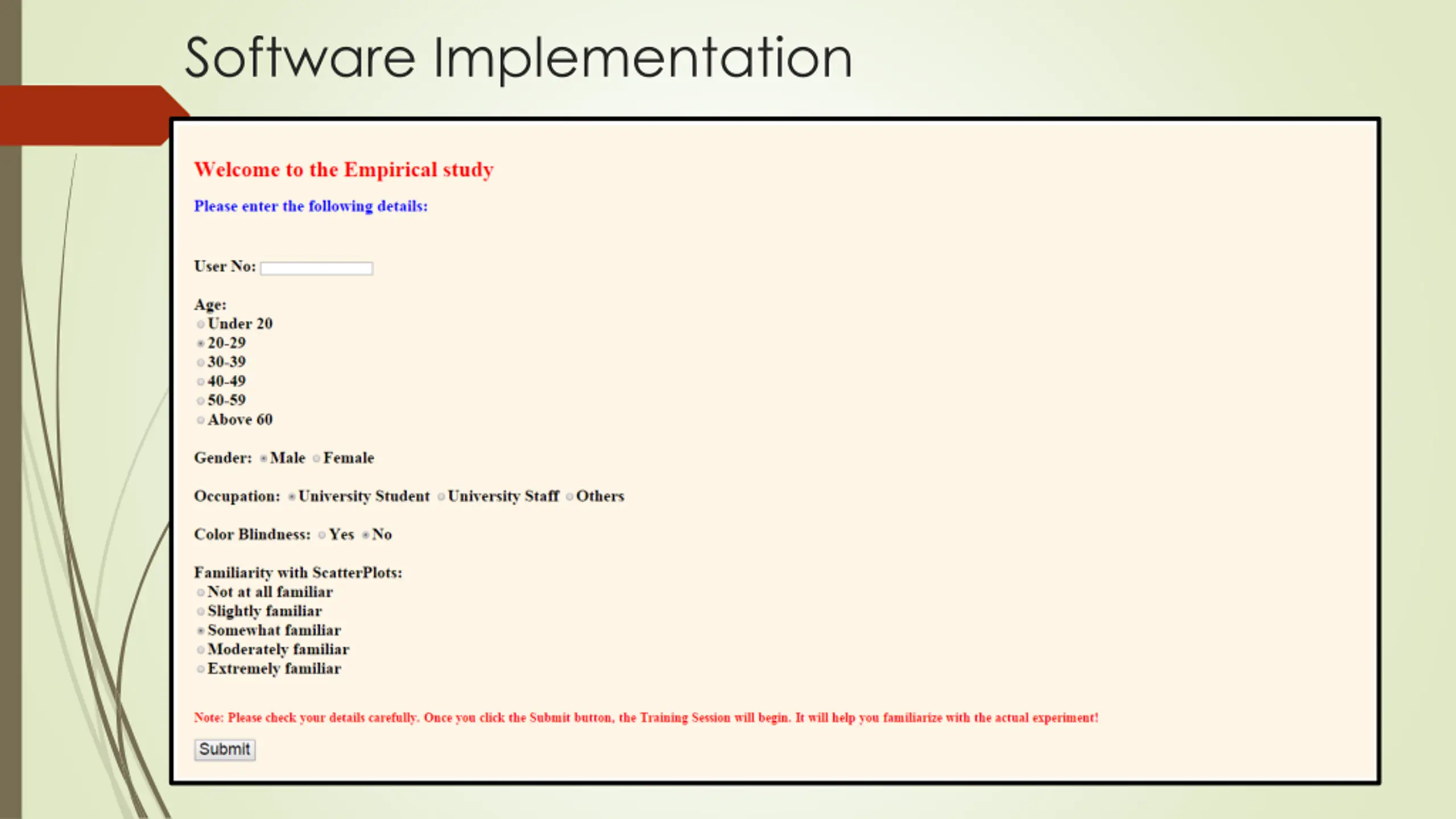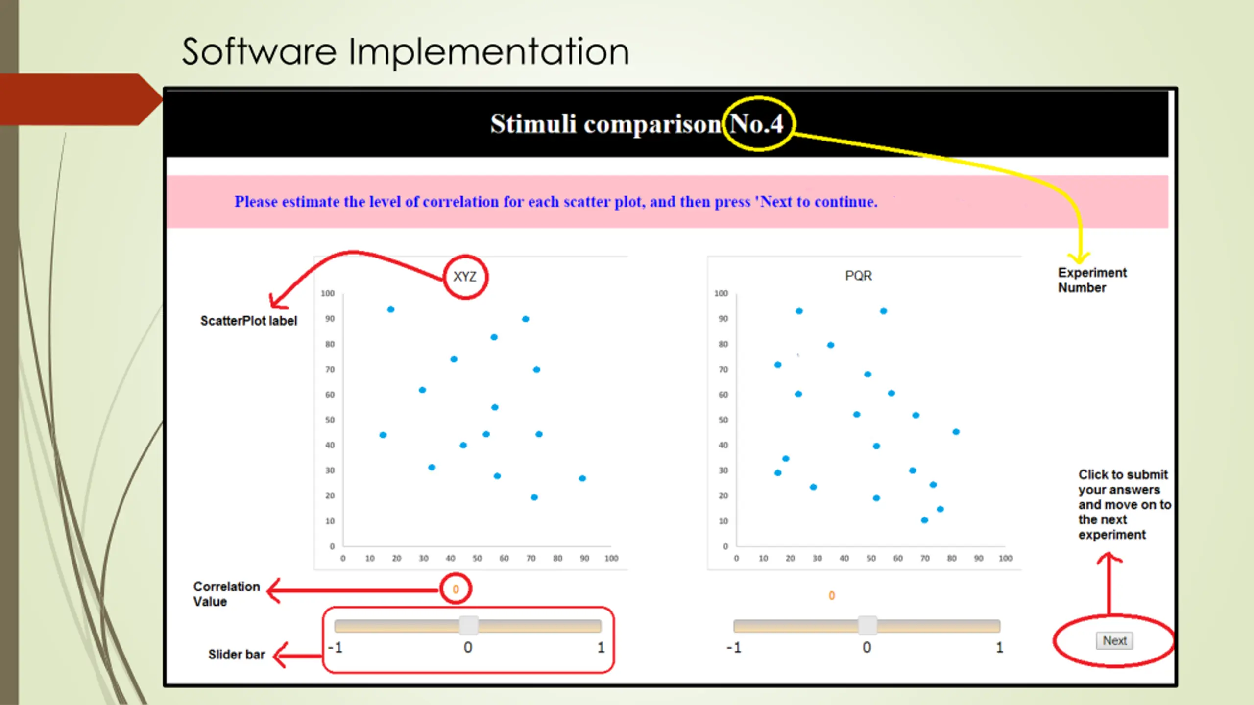 Software Implementation Deployed Agile Software Development process - incremental model Written using JavaScript, HTML, PHP Collects user response in form of subjective correlation values when presented with different SCPs in accordance with the principal of repeated measures. Procedure: Pre-study presentation Collecting demographic information using radio buttons, text boxes and Likert scaling for familiarity ratings Training session providing feedback Testing session for the main trials Display 2 SCPs on the screen Use respective slider bars to record answers for each one Press Next button to move onto next trial Timely break intervals to reduce fatigue and boredom Check points to monitor participant performance and detect random-clicks. Masking screen to relax the eye vision Amazon voucher as a thank-you token Feedback survey