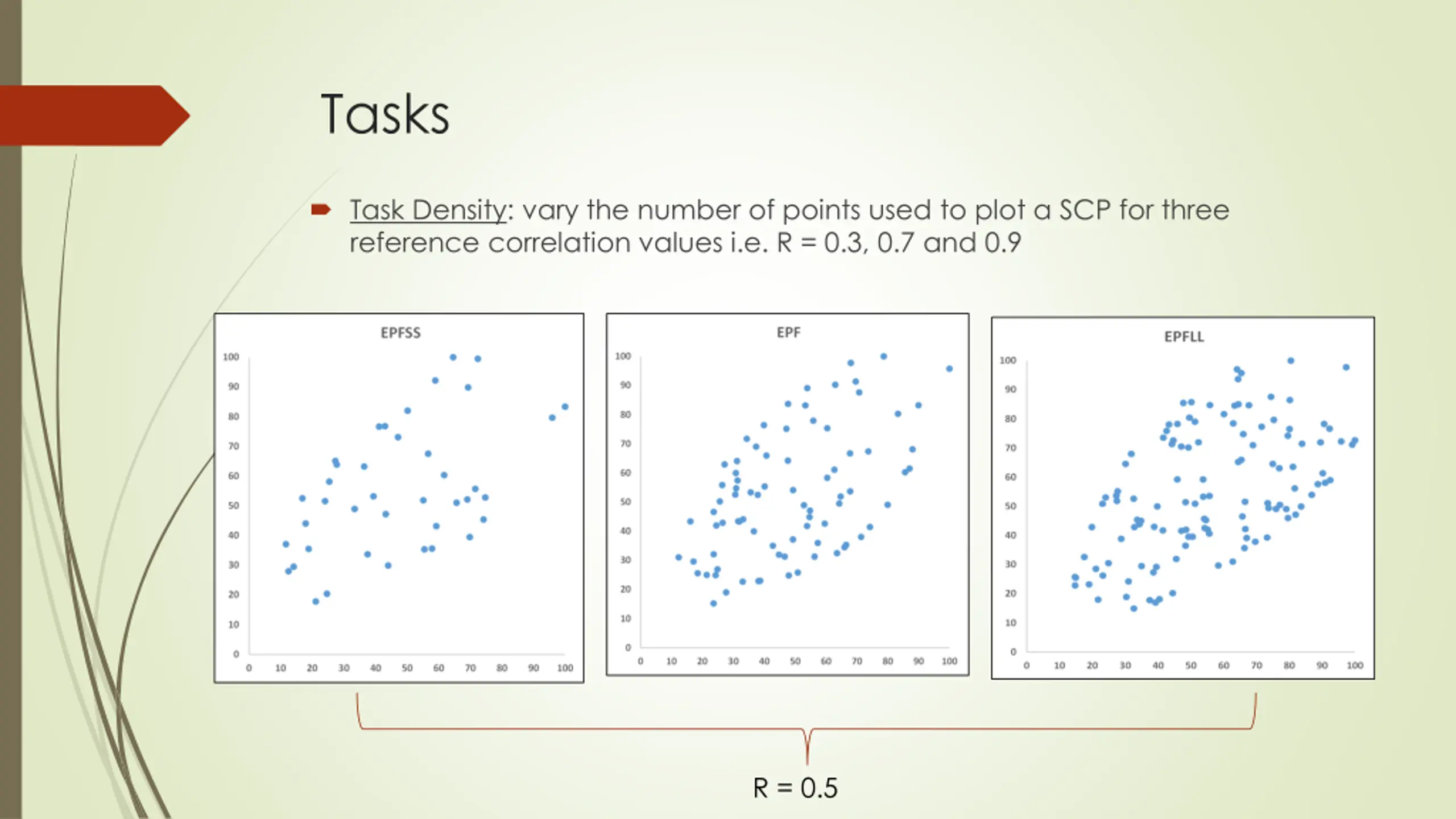 Tasks Task Density: vary the number of points used to plot a SCP for three reference correlation values i.e. R = 0.3, 0.7 and 0.9 R = 0.5