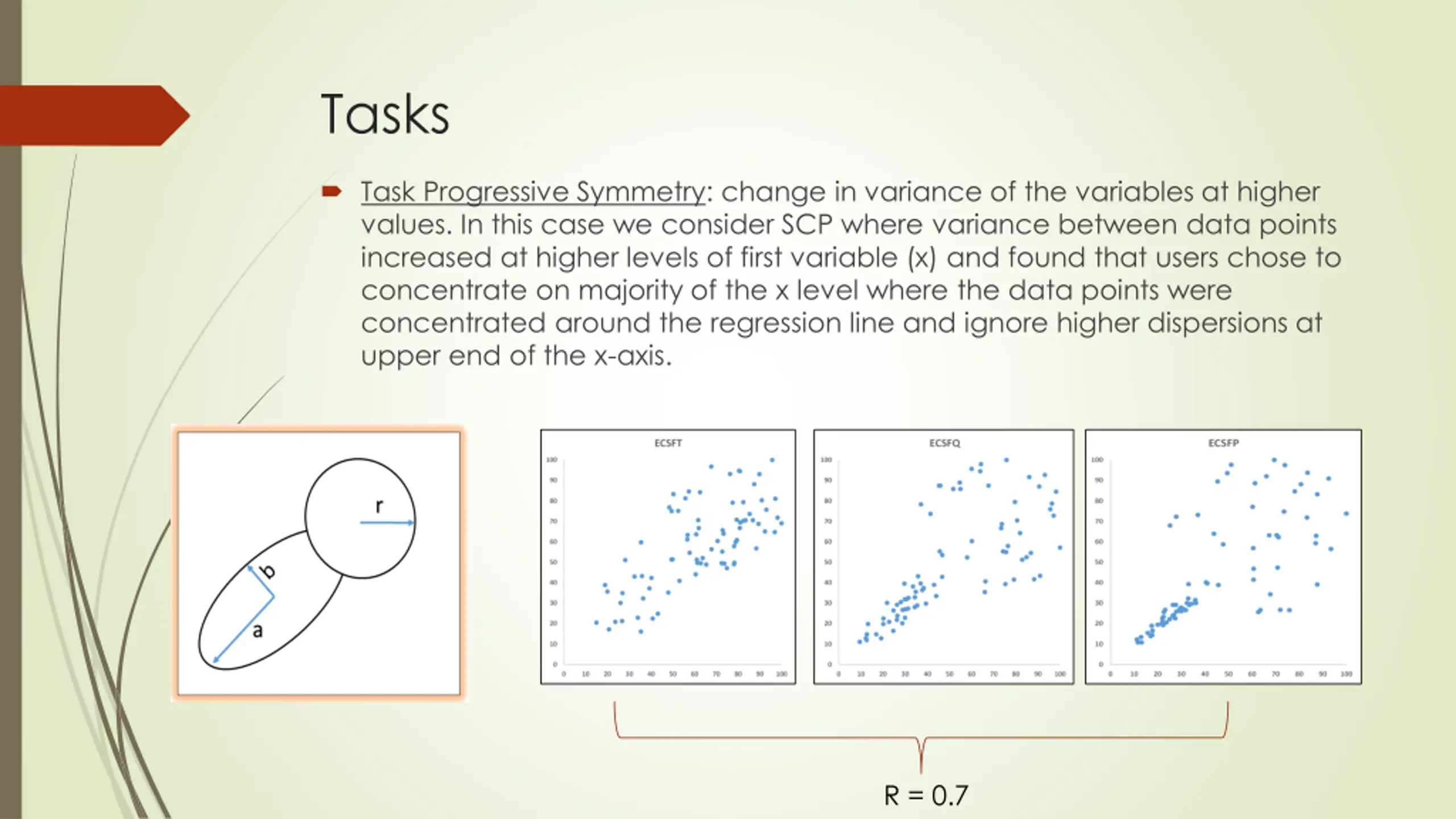 Tasks Task Progressive Symmetry: change in variance of the variables at higher values. In this case we consider SCP where variance between data points increased at higher levels of first variable (x) and found that users chose to concentrate on majority of the x level where the data points were concentrated around the regression line and ignore higher dispersions at upper end of the x-axis. R = 0.7