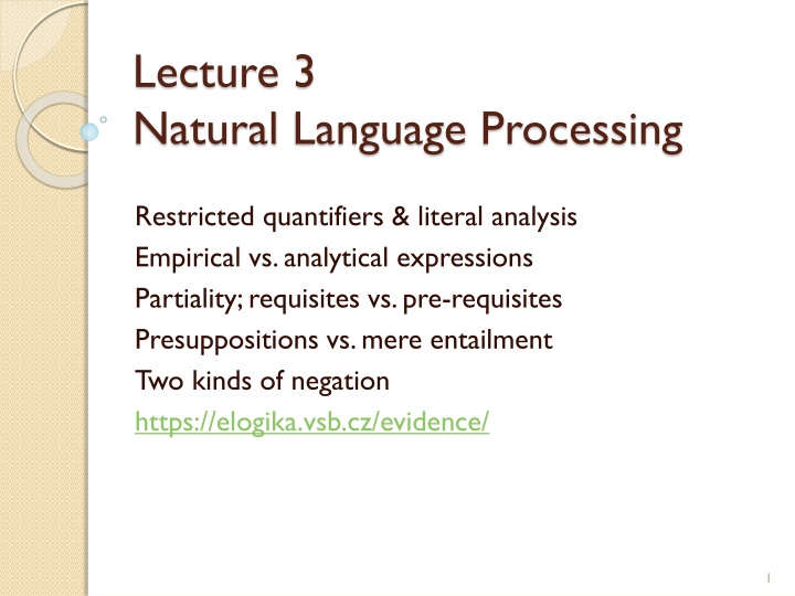 Lecture 3 Natural Language Processing Restricted quantifiers & literal analysis Empirical vs. analytical expressions Partiality; requisites vs. pre-requisites Presuppositions vs. mere entailment Two kinds of negation https://elogika.vsb.cz/evidence/ 1
