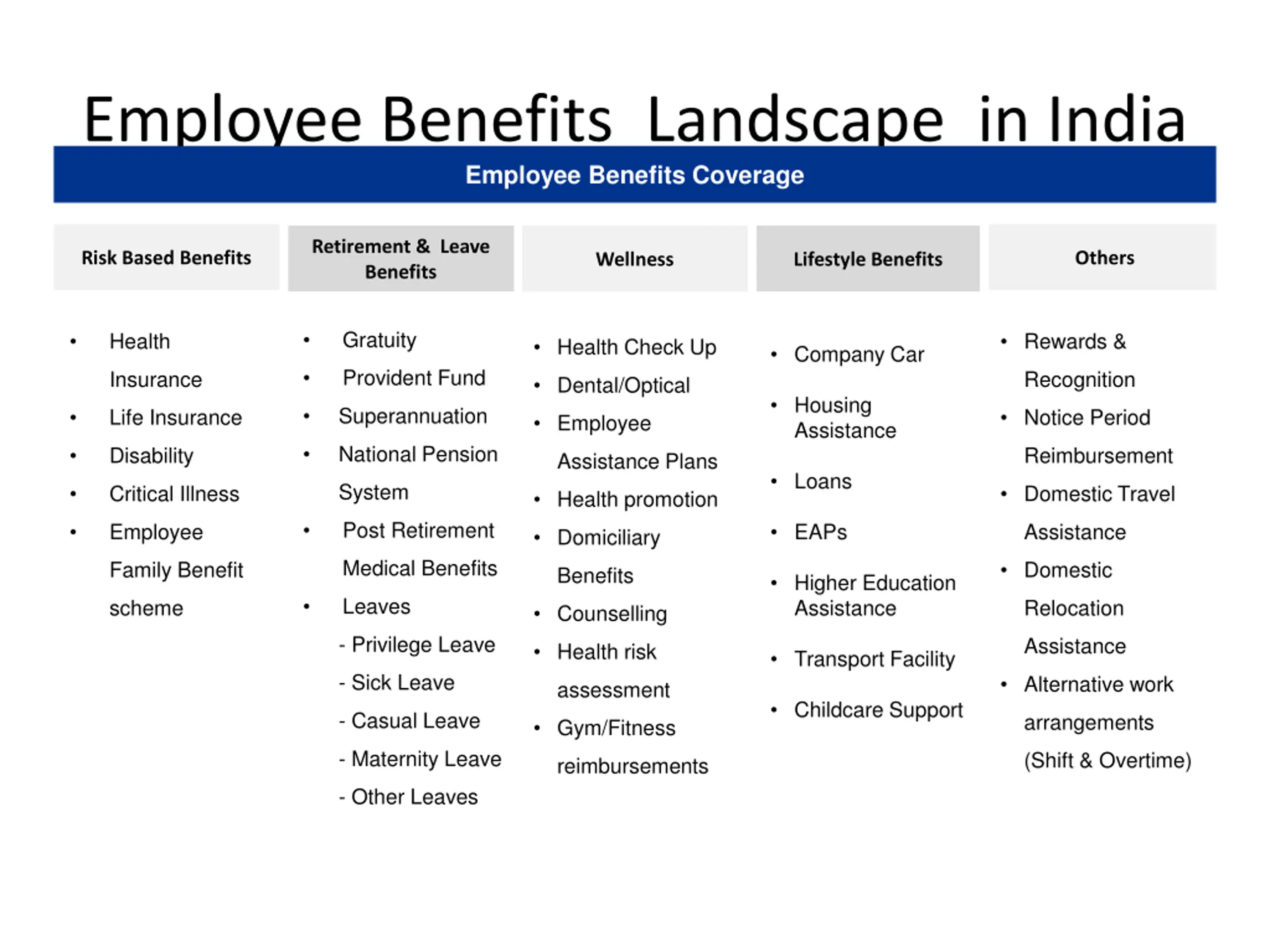 Employee Benefits Landscape in India Employee Benefits Coverage Retirement & Leave Benefits Risk Based Benefits Others Wellness Lifestyle Benefits Gratuity Health Rewards & Health Check Up Company Car Provident Fund Insurance Recognition Dental/Optical Housing Assistance Superannuation Life Insurance Notice Period Employee National Pension Disability Reimbursement Assistance Plans Loans System Critical Illness Domestic Travel Health promotion Post Retirement Employee Assistance EAPs Domiciliary Medical Benefits Family Benefit Domestic Benefits Higher Education Assistance Leaves scheme Relocation Counselling - Privilege Leave Assistance Health risk Transport Facility - Sick Leave Alternative work assessment Childcare Support - Casual Leave arrangements Gym/Fitness - Maternity Leave (Shift & Overtime) reimbursements - Other Leaves