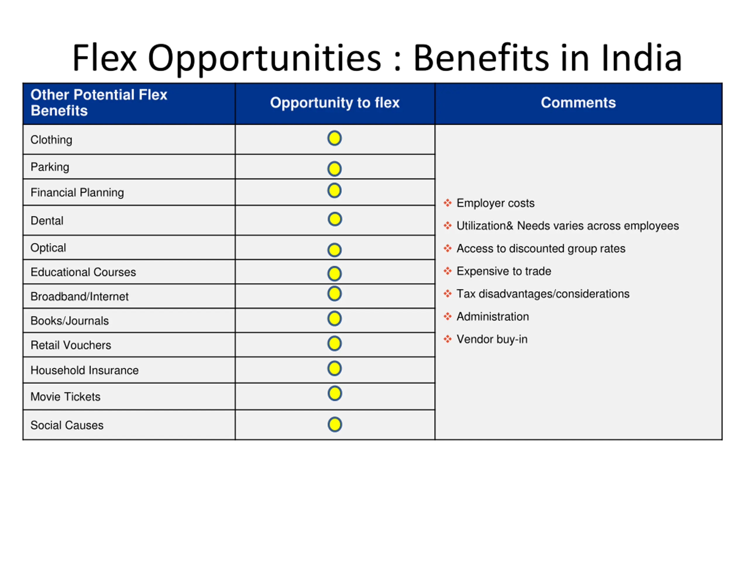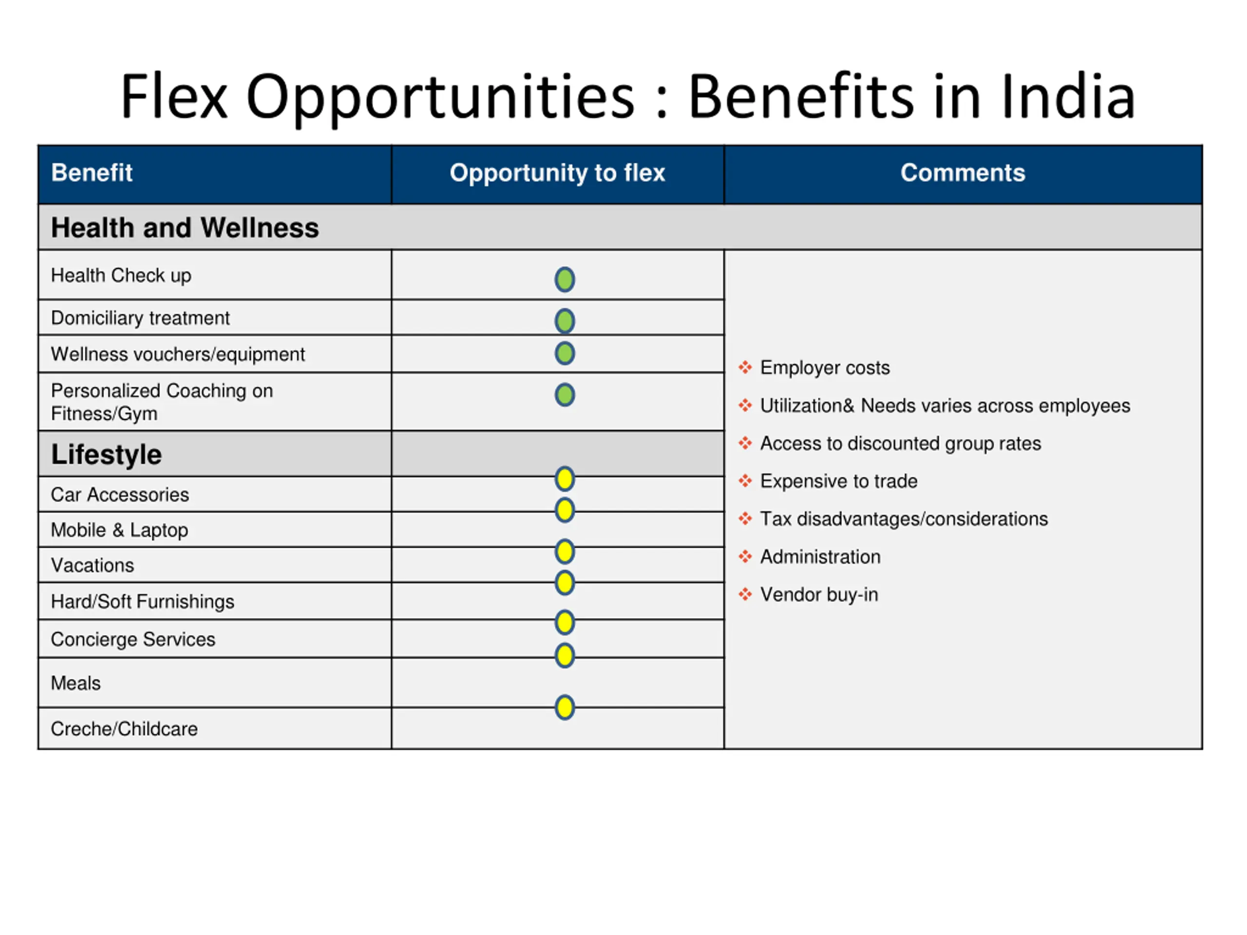 Flex Opportunities : Benefits in India Benefit Opportunity to flex Comments Health and Wellness Health Check up Domiciliary treatment Wellness vouchers/equipment Employer costs Personalized Coaching on Fitness/Gym Lifestyle Utilization& Needs varies across employees Access to discounted group rates Expensive to trade Car Accessories Tax disadvantages/considerations Mobile & Laptop Administration Vacations Vendor buy-in Hard/Soft Furnishings Concierge Services Meals Creche/Childcare