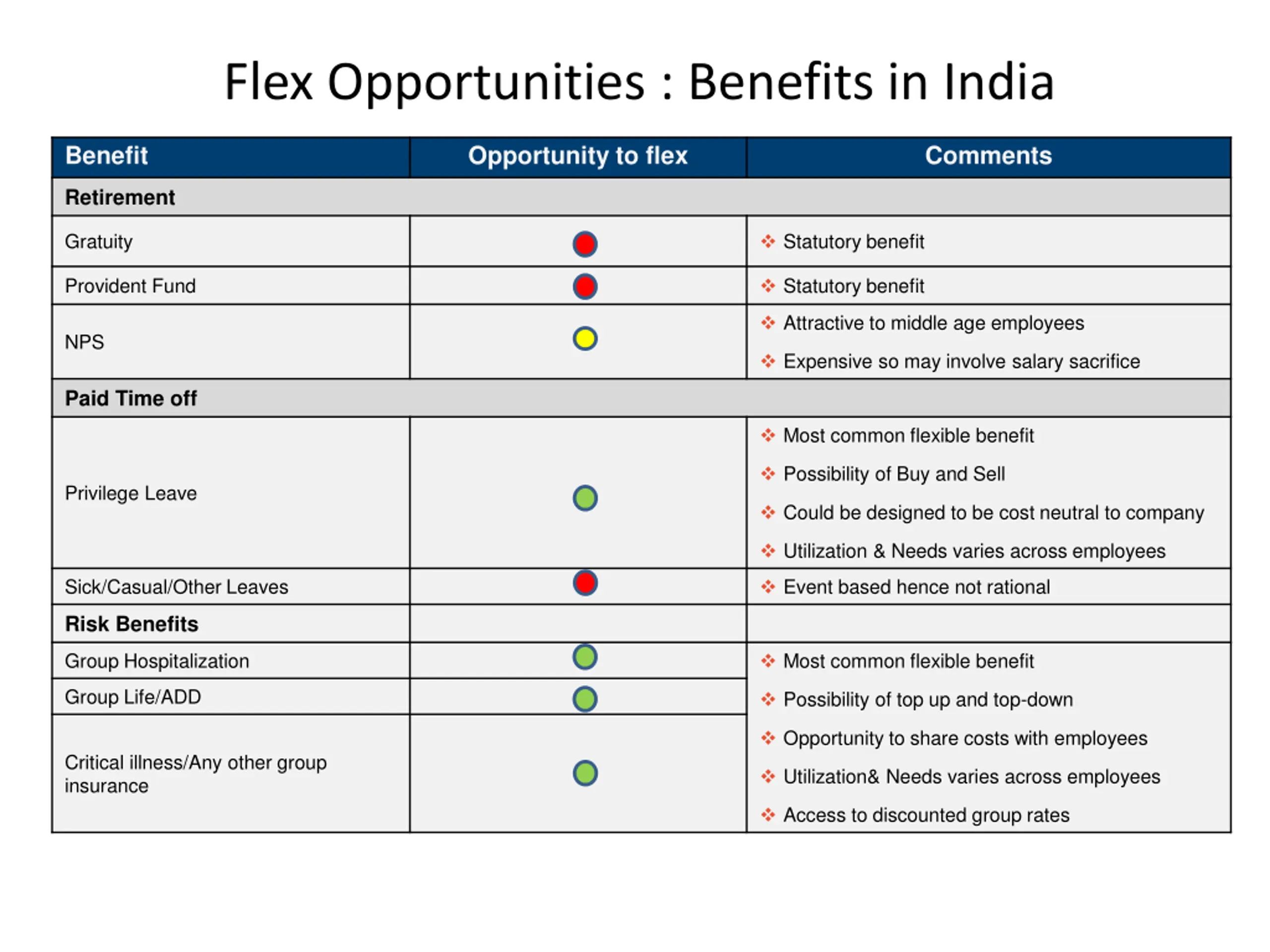 Flex Opportunities : Benefits in India Benefit Opportunity to flex Comments Retirement Gratuity Statutory benefit Provident Fund Statutory benefit Attractive to middle age employees NPS Expensive so may involve salary sacrifice Paid Time off Most common flexible benefit Possibility of Buy and Sell Privilege Leave Could be designed to be cost neutral to company Utilization & Needs varies across employees Sick/Casual/Other Leaves Event based hence not rational Risk Benefits Group Hospitalization Most common flexible benefit Group Life/ADD Possibility of top up and top-down Opportunity to share costs with employees Critical illness/Any other group insurance Utilization& Needs varies across employees Access to discounted group rates