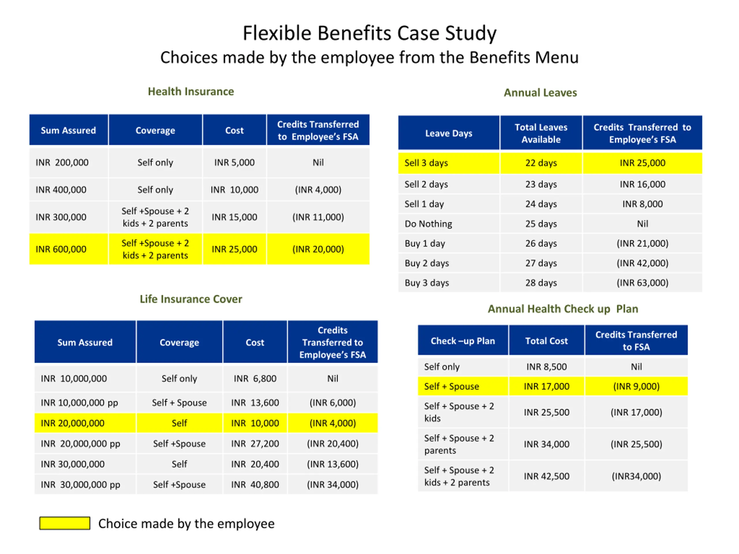 Flexible Benefits Case Study Employees Final Order FSA Opening balance INR 24,000 Credits Transferred to Employee s FSA Benefit Benefit Chosen INR 600,000 Health Insurance (INR 20,000) Self + Spouse +2 Kids + 2 Parents Life Insurance INR 20,000,000 for Self Only (INR 4,000) Health check up Self + Spouse (INR 9,000) Annual Leaves Sell 3 days INR 24,000 INR 15,000 (Carry Forward) FSA Closing balance