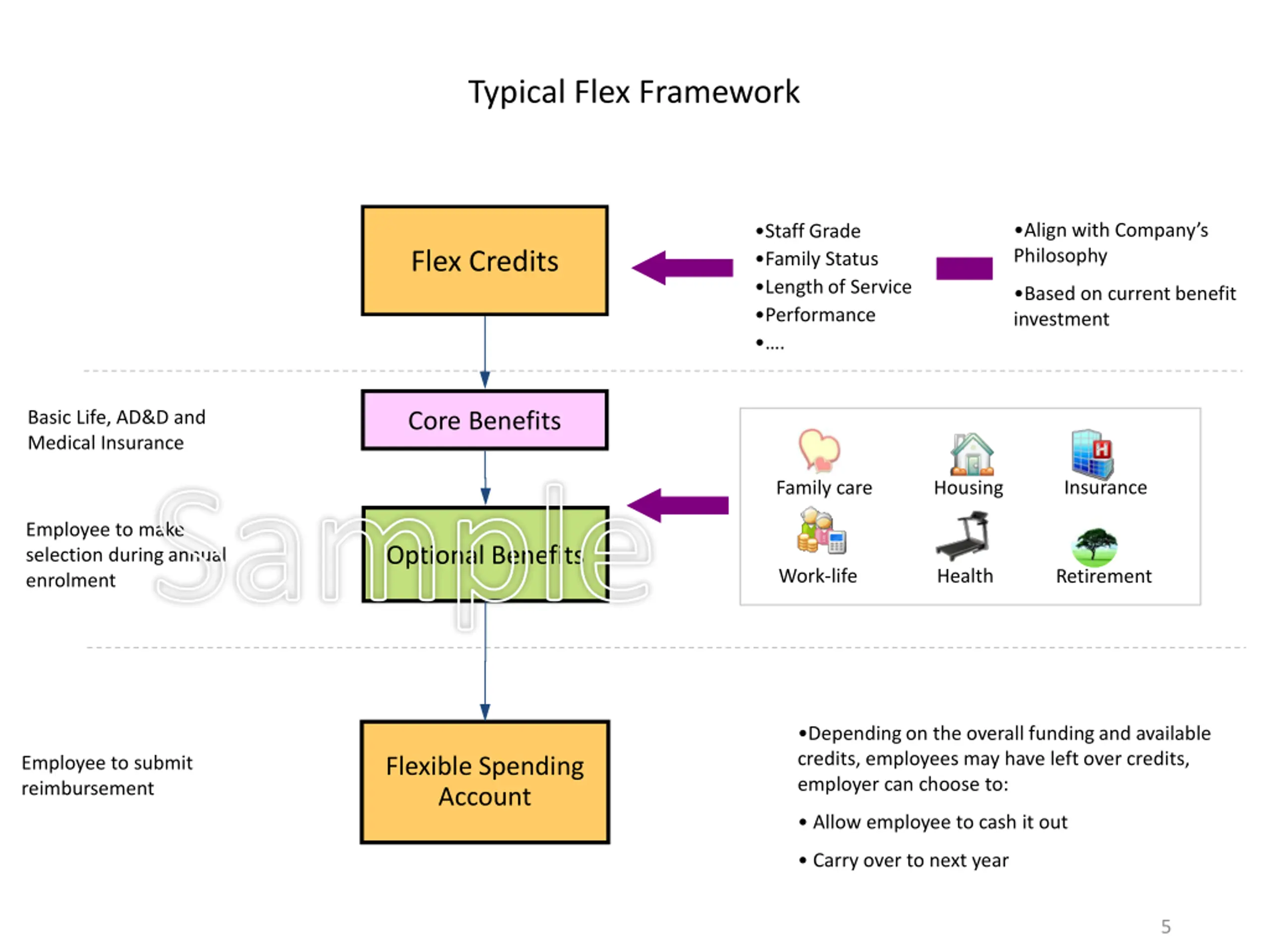 Typical Flex Framework Align with Company s Philosophy Staff Grade Family Status Length of Service Performance . Flex Credits Based on current benefit investment Basic Life, AD&D and Medical Insurance Core Benefits Sample Insurance Family care Housing Employee to make selection during annual enrolment Optional Benefits Work-life Health Retirement Depending on the overall funding and available credits, employees may have left over credits, employer can choose to: Employee to submit reimbursement Flexible Spending Account Allow employee to cash it out Carry over to next year 5