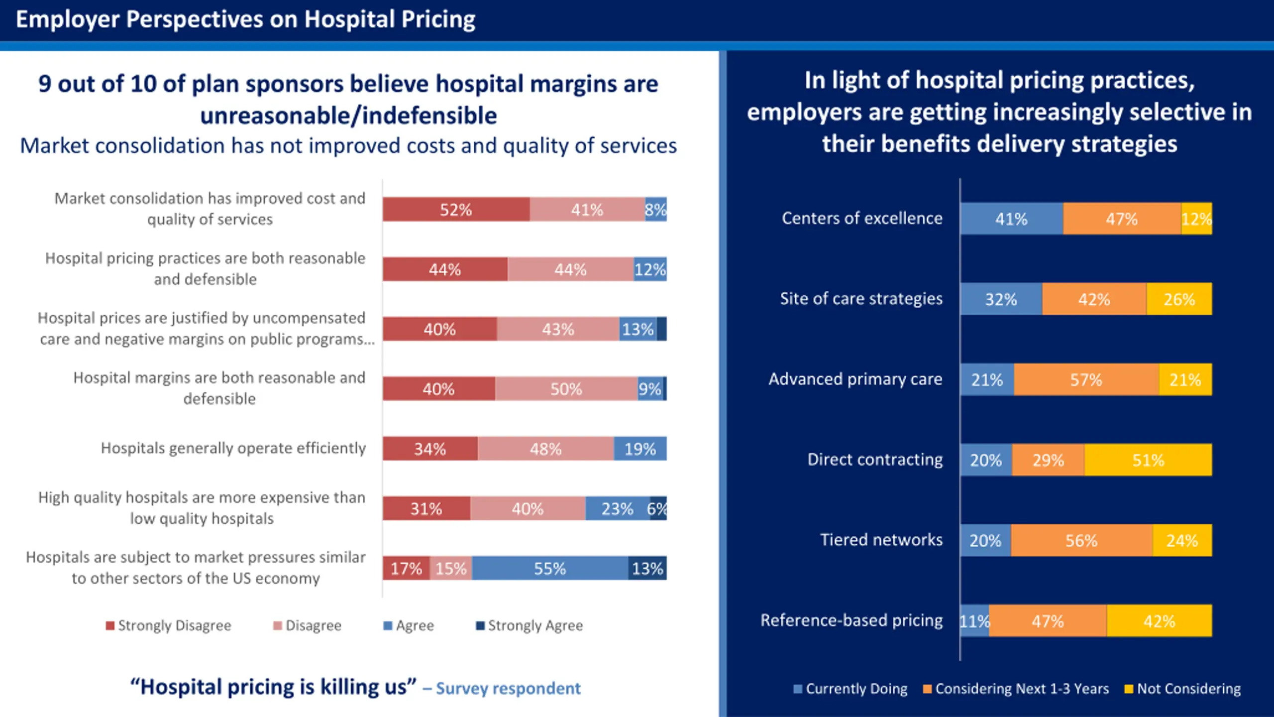 Employer Perspectives on Hospital Pricing In light of hospital pricing practices, employers are getting increasingly selective in their benefits delivery strategies 9 out of 10 of plan sponsors believe hospital margins are unreasonable/indefensible Market consolidation has not improved costs and quality of services Market consolidation has improved cost and quality of services 52% 41% 8% Centers of excellence 41% 47% 12% Hospital pricing practices are both reasonable and defensible 44% 44% 12% Site of care strategies 32% 42% 26% Hospital prices are justified by uncompensated care and negative margins on public programs 40% 43% 13% Hospital margins are both reasonable and defensible Advanced primary care 21% 57% 21% 40% 50% 9% Hospitals generally operate efficiently 34% 48% 19% Direct contracting 20% 29% 51% High quality hospitals are more expensive than low quality hospitals 31% 40% 23% 6% Tiered networks 20% 56% 24% Hospitals are subject to market pressures similar to other sectors of the US economy 17% 15% 55% 13% Reference-based pricing 11% 47% 42% Strongly Disagree Disagree Agree Strongly Agree Hospital pricing is killing us Survey respondent Currently Doing Considering Next 1-3 Years Not Considering