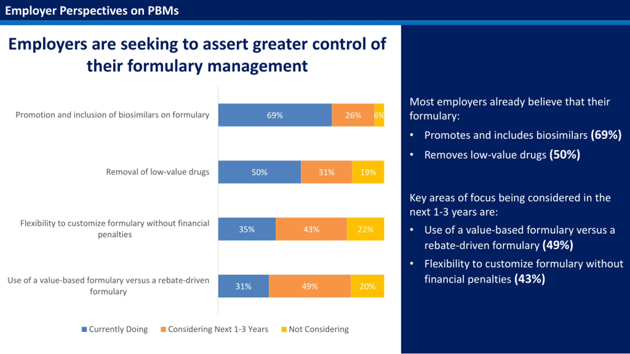 Employer Perspectives on PBMs Employers are seeking to assert greater control of their formulary management Most employers already believe that their formulary: Promotes and includes biosimilars (69%) Removes low-value drugs (50%) Promotion and inclusion of biosimilars on formulary 69% 26% 6% Removal of low-value drugs 50% 31% 19% Key areas of focus being considered in the next 1-3 years are: Use of a value-based formulary versus a rebate-driven formulary (49%) Flexibility to customize formulary without financial penalties (43%) Flexibility to customize formulary without financial penalties 35% 43% 22% Use of a value-based formulary versus a rebate-driven formulary 31% 49% 20% Currently Doing Considering Next 1-3 Years Not Considering