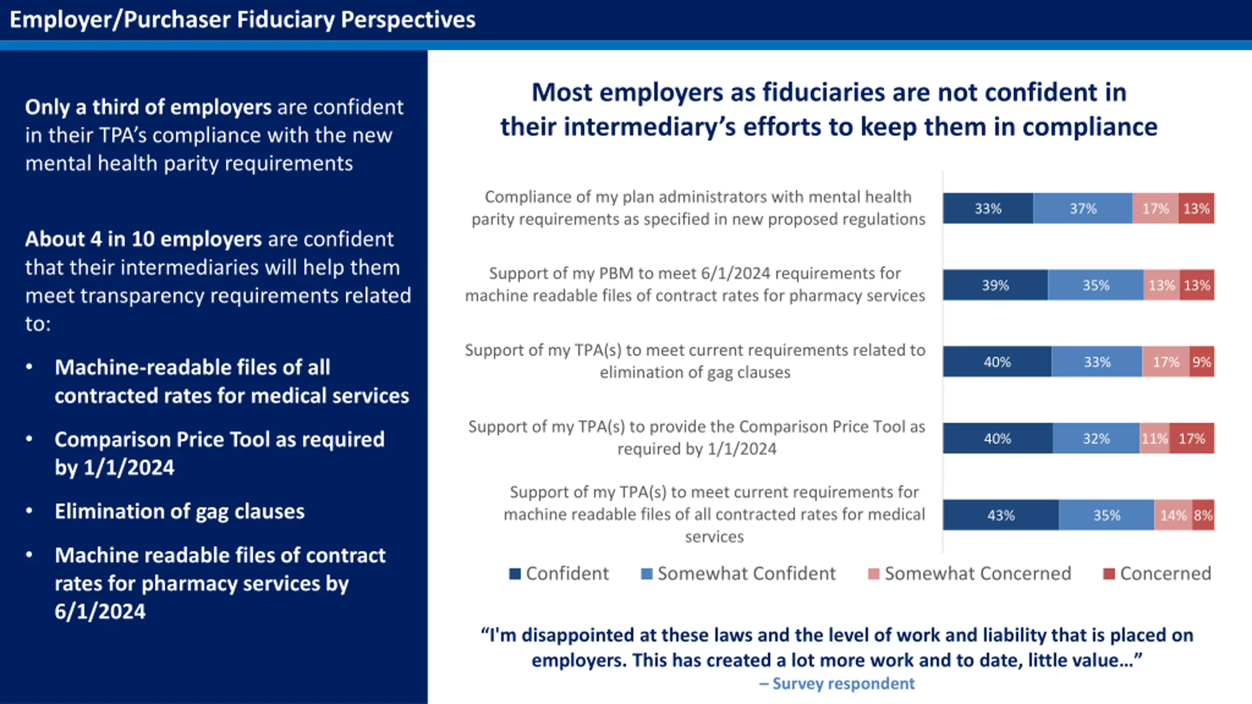 Employer/Purchaser Fiduciary Perspectives Most employers as fiduciaries are not confident in their intermediary s efforts to keep them in compliance Only a third of employers are confident in their TPA s compliance with the new mental health parity requirements Compliance of my plan administrators with mental health parity requirements as specified in new proposed regulations 33% 37% 17% 13% About 4 in 10 employers are confident that their intermediaries will help them meet transparency requirements related to: Support of my PBM to meet 6/1/2024 requirements for machine readable files of contract rates for pharmacy services 39% 35% 13% 13% Support of my TPA(s) to meet current requirements related to elimination of gag clauses 40% 33% 17% 9% Machine-readable files of all contracted rates for medical services Support of my TPA(s) to provide the Comparison Price Tool as required by 1/1/2024 Comparison Price Tool as required by 1/1/2024 40% 32% 11% 17% Support of my TPA(s) to meet current requirements for machine readable files of all contracted rates for medical services Elimination of gag clauses 43% 35% 14% 8% Machine readable files of contract rates for pharmacy services by 6/1/2024 Confident Somewhat Confident Somewhat Concerned Concerned I'm disappointed at these laws and the level of work and liability that is placed on employers. This has created a lot more work and to date, little value Survey respondent